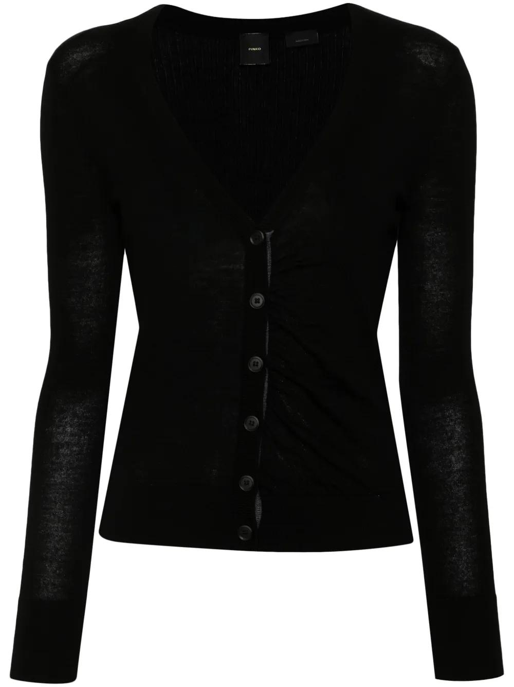 black wool fine knit ribbed V-neck front button fastening ruched detailing long sleeves ribbed cuffs and hem