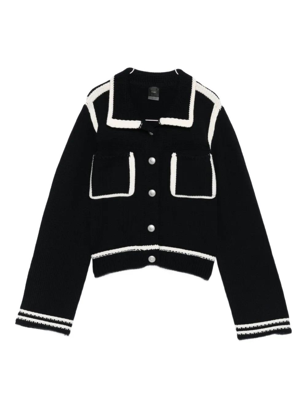 navy blue ribbed knit contrasting trim patch pockets button front fastening sailor collar