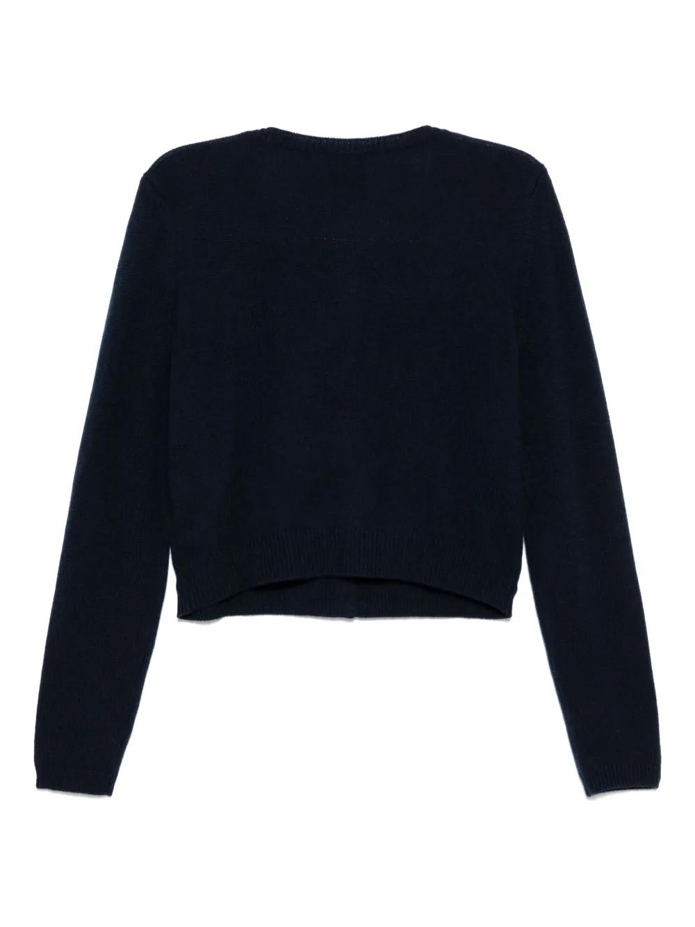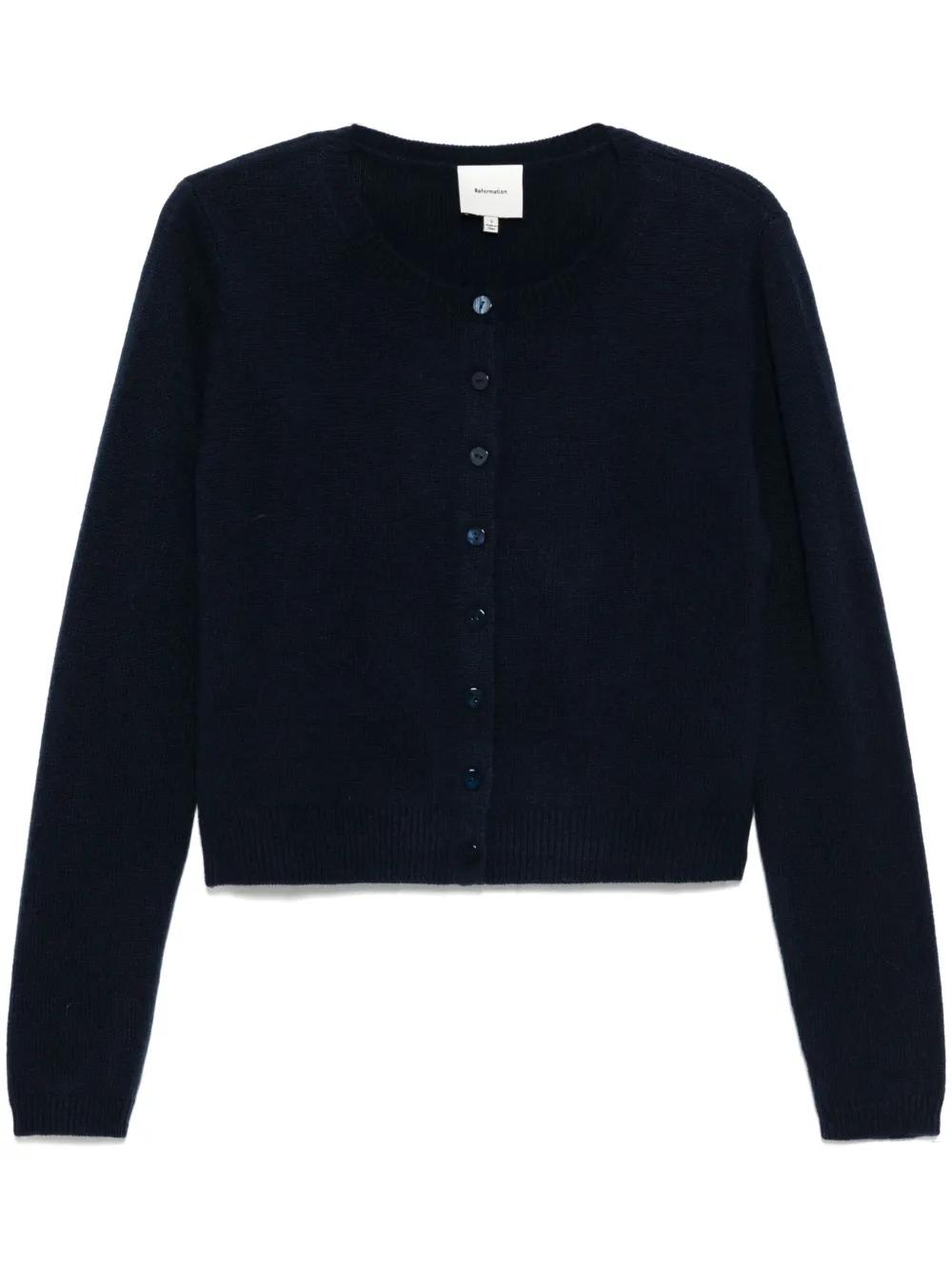 blue recycled cashmere blend knitted construction front button fastening crew neck long sleeves ribbed cuffs and hem straight hem