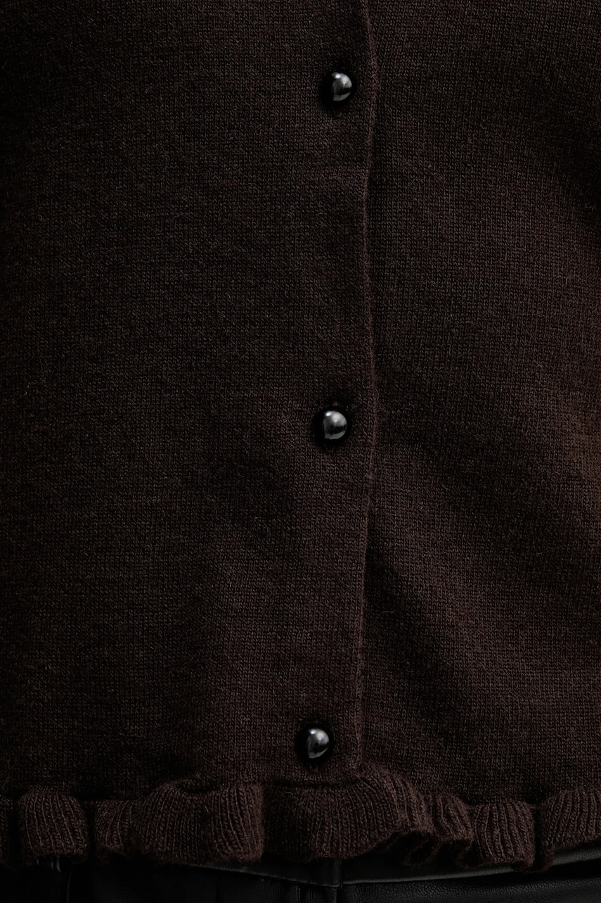 - Model z dodatkiem wełny kaszmirowej. - Kardigan w fasonie regular zapewnia wygodę i uniwersalny wygląd. Delikatnie dopasowuje się do sylwetki, ale nie podkreśla jej nadmiernie. Klasyczny i prosty, sprawdzi się zarówno w eleganckich, jak i casualowych stylizacjach. - Zapięcie na guziki. - Model z ozdobnymi falbanami. - Model z miękkim kołnierzykiem. - Cienka, elastyczna dzianina. - Długość rękawa: 65 cm. - Długość: 50 cm. - Szerokość pod pachami: 45 cm. - Wymiary podane dla rozmiaru: S.
