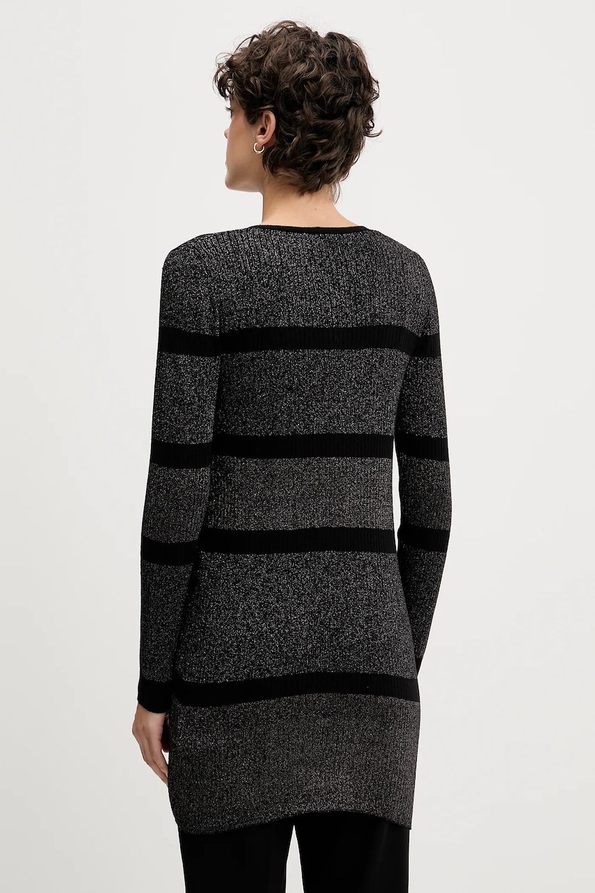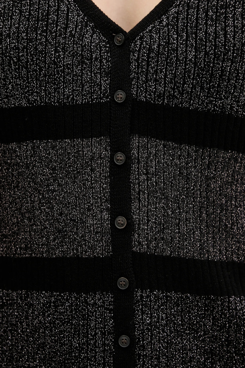 - Dopasowany, podkreślający sylwetkę fason. - Długie, dopasowane rękawy. - Zapięcie na guziki umożliwia łatwe zakładanie i zdejmowanie. - Rękawy i dolna krawędź zakończona ściągaczami chroniącymi przed niekorzystnymi warunkami atmosferycznymi. - Prążkowana struktura materiału sprawia, że jest on niezwykle elastyczny i doskonale przylega do ciała. - Splot z ozdobną, metaliczną nicią. - Długość rękawa: 62 cm. - Długość: 80 cm. - Szerokość pod pachami: 45 cm. - Wymiary podane dla rozmiaru: S.
