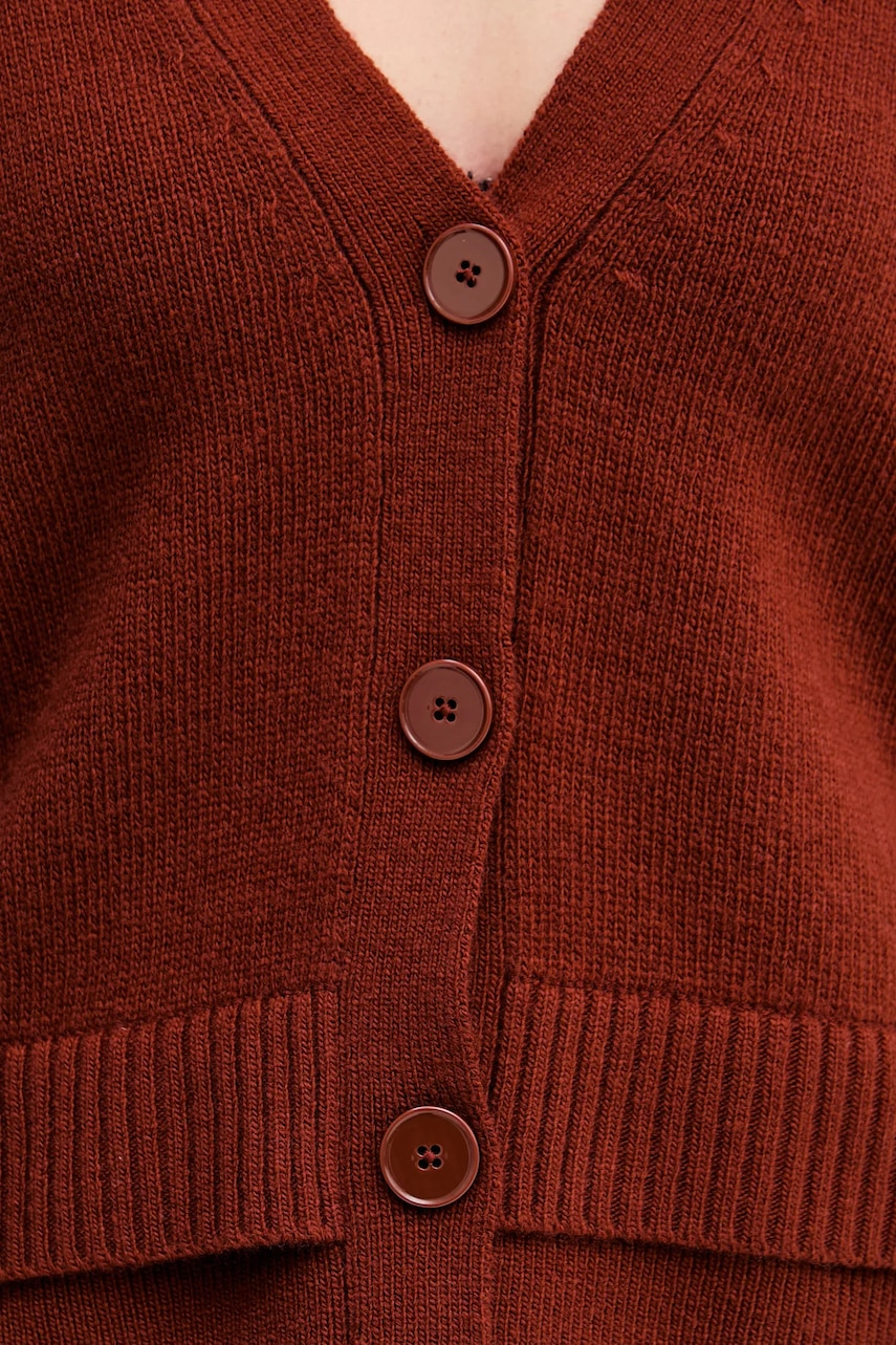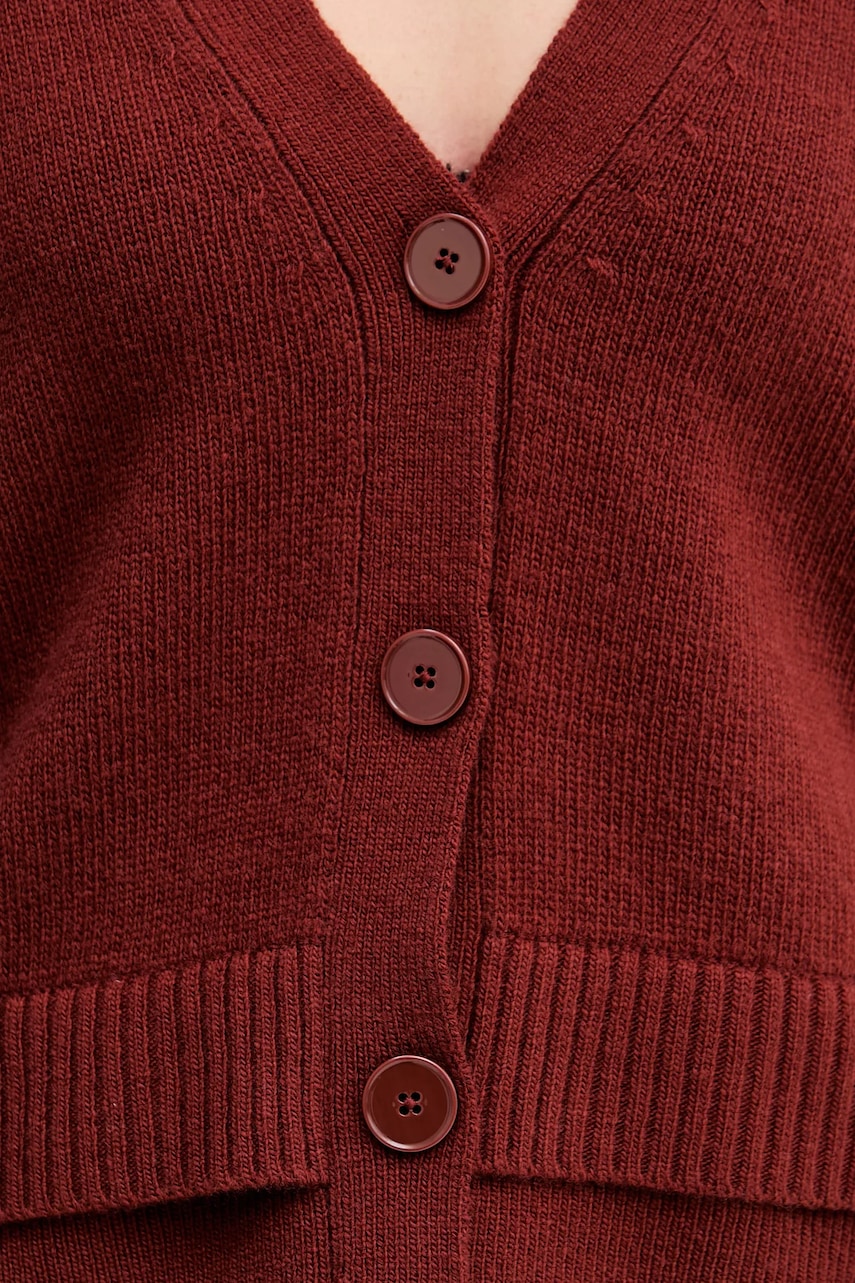 - Kardigan w fasonie regular zapewnia wygodę i uniwersalny wygląd. Delikatnie dopasowuje się do sylwetki, ale nie podkreśla jej nadmiernie. Klasyczny i prosty, sprawdzi się zarówno w eleganckich, jak i casualowych stylizacjach. - Zapięcie na guziki. - Cienka, elastyczna dzianina. - Wykończenie ze ściągacza. - Długość rękawa: 62 cm. - Długość: 54 cm. - Szerokość pod pachami: 50 cm. - Wymiary podane dla rozmiaru: S.