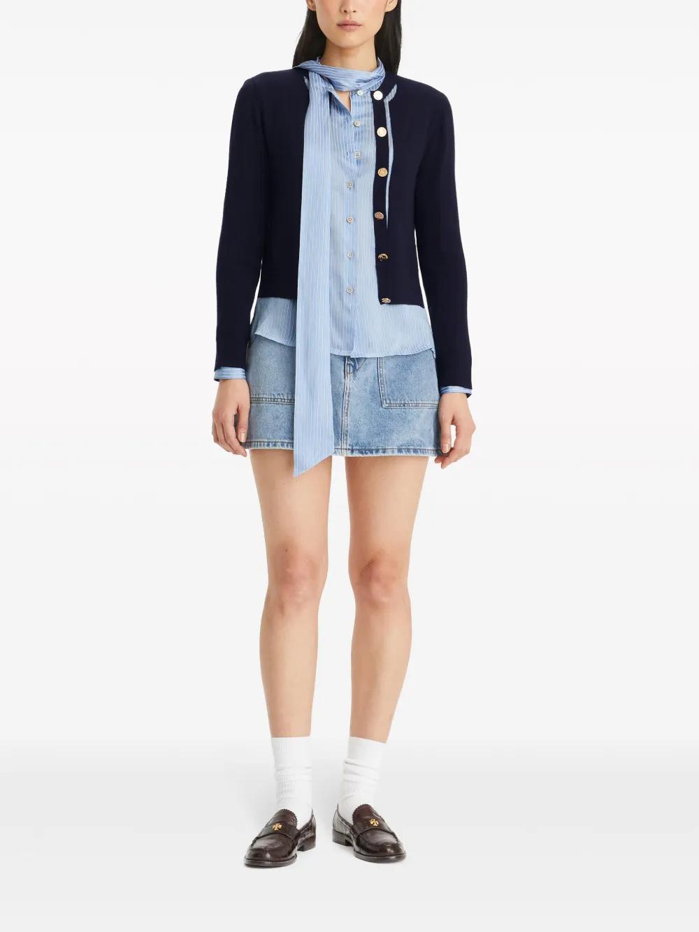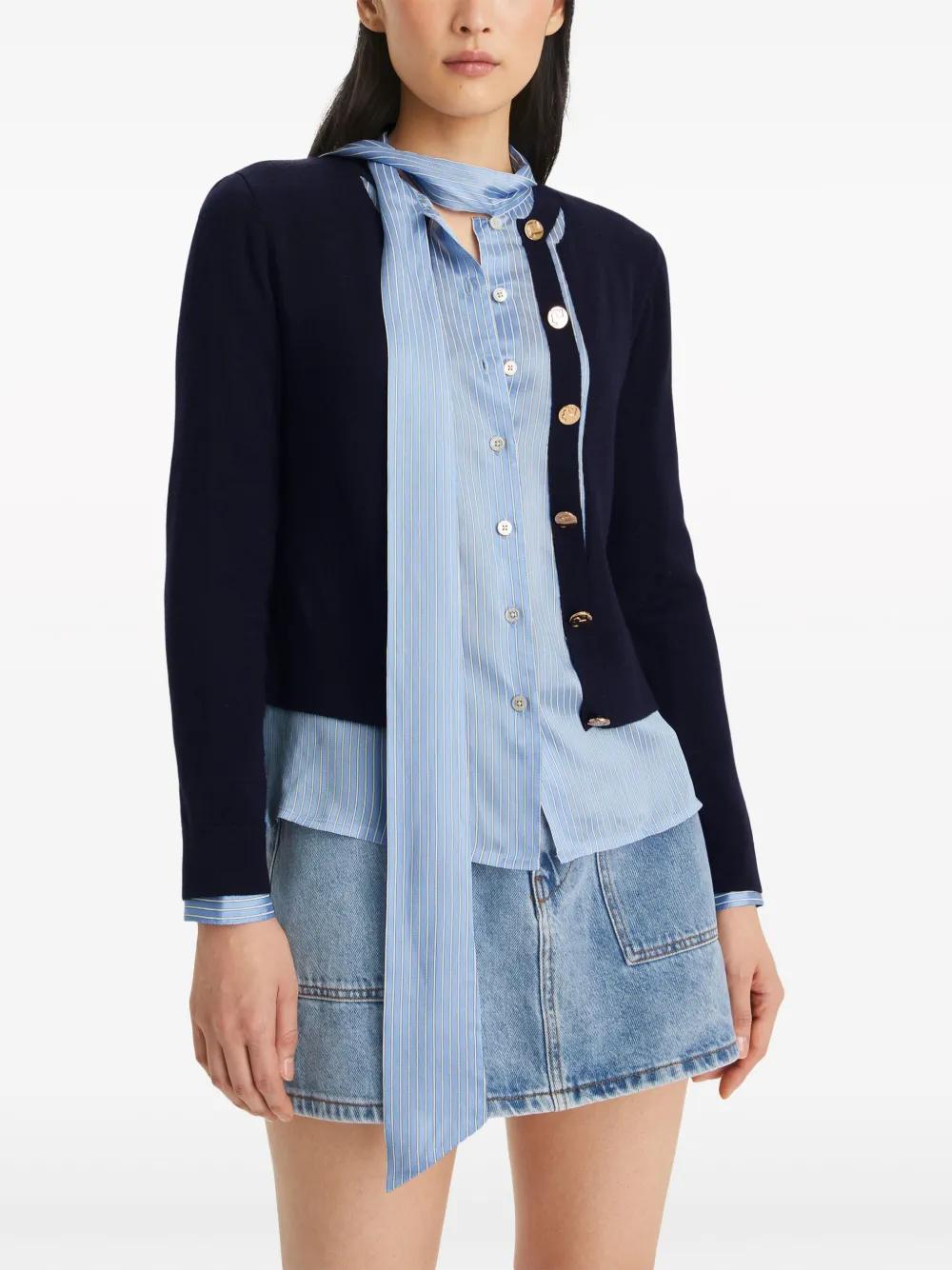navy blue/light blue wool layered design cut-out detailing pussy-bow collar front button fastening long sleeves straight hem
