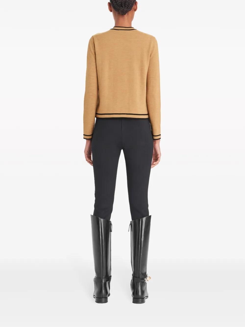 camel brown merino wool knitted construction front button fastening logo-embossed buttons stripe detailing round neck long sleeves silk lining straight hem