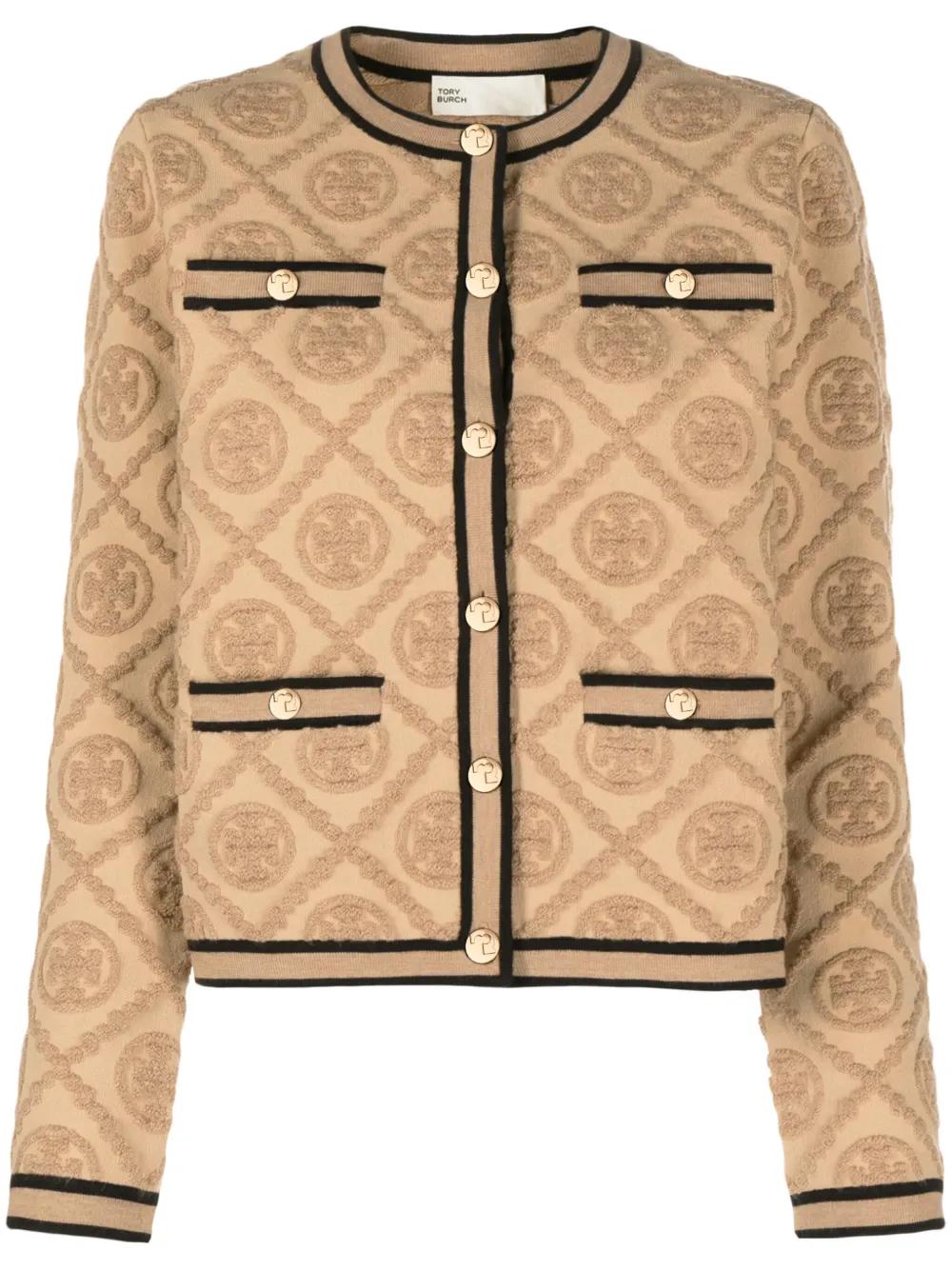 camel brown/black knitted construction signature Double T motif embossed monogram pattern striped edge logo-debossed buttons gold-tone buttons round neck front button fastening long sleeves ribbed cuffs two faux chest pockets two front button-fastening jetted pockets ribbed hem