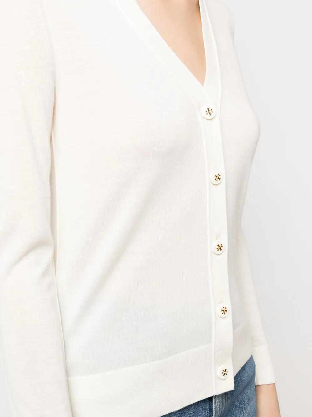 ivory white wool-silk blend fine knit logo-engraved buttons front button fastening plunging V-neck long sleeves straight hem