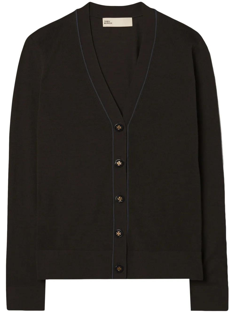 black wool-silk blend fine knit logo-embossed buttons V-neck front button fastening long sleeves straight hem
