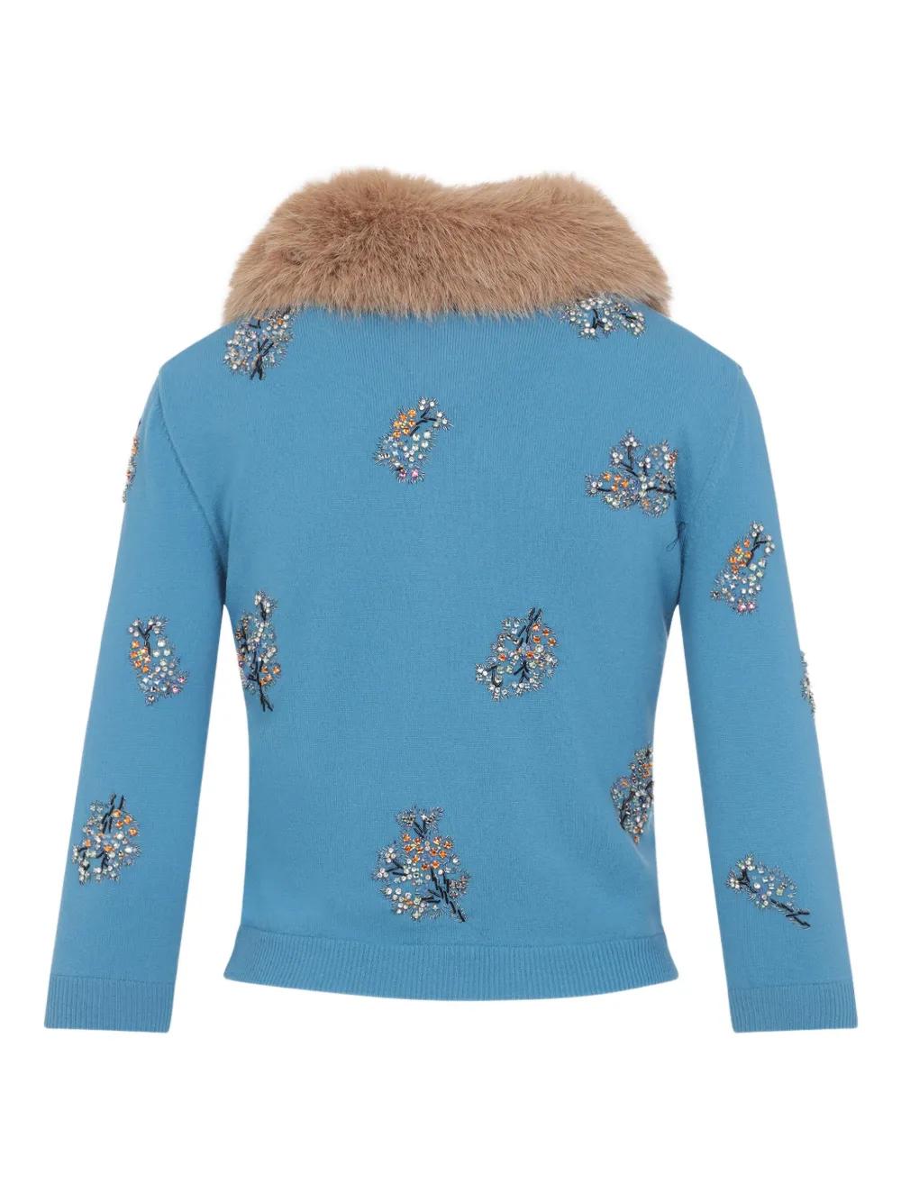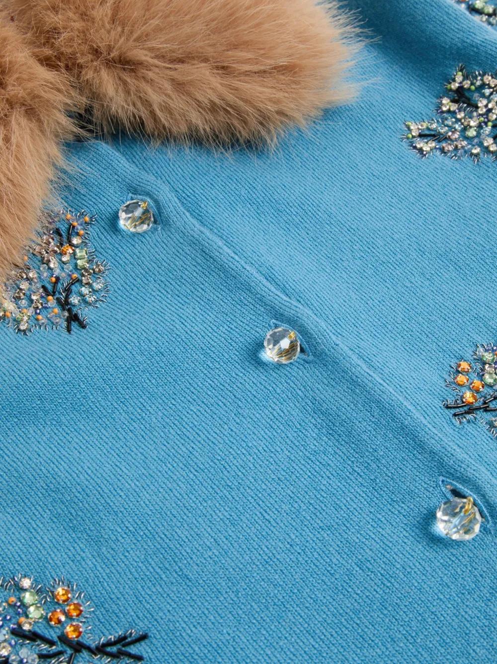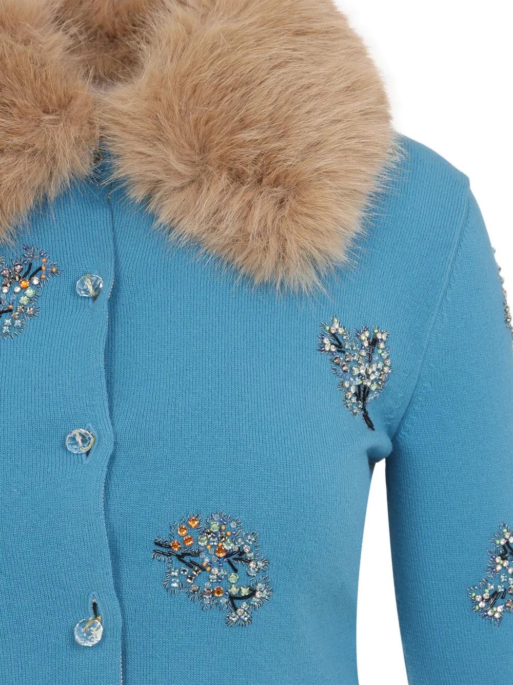 blue buttons-fastening faux-fur collar bead-detail long-sleeves ribbed cuffs and hem jacquard lining crystal buttons