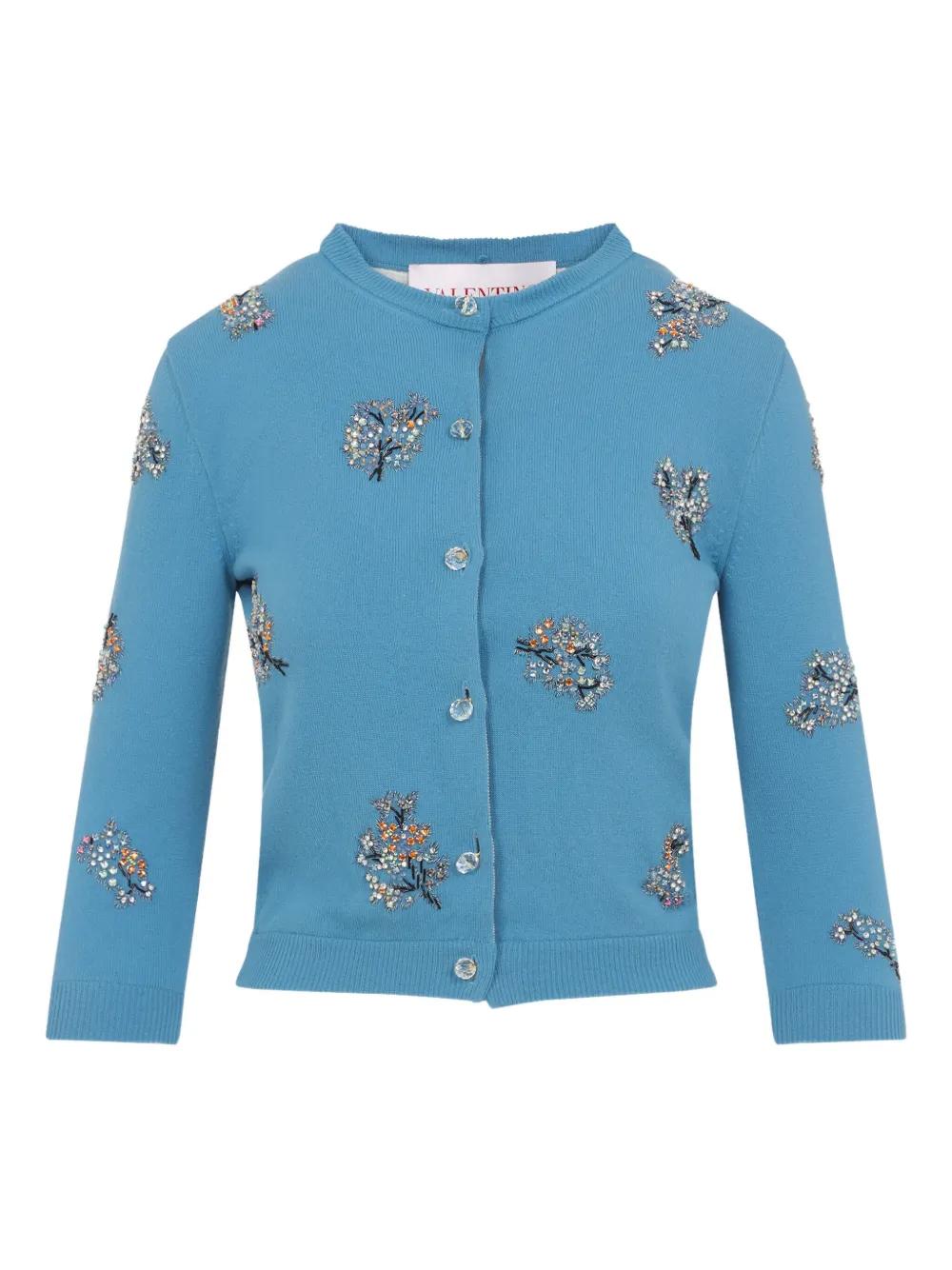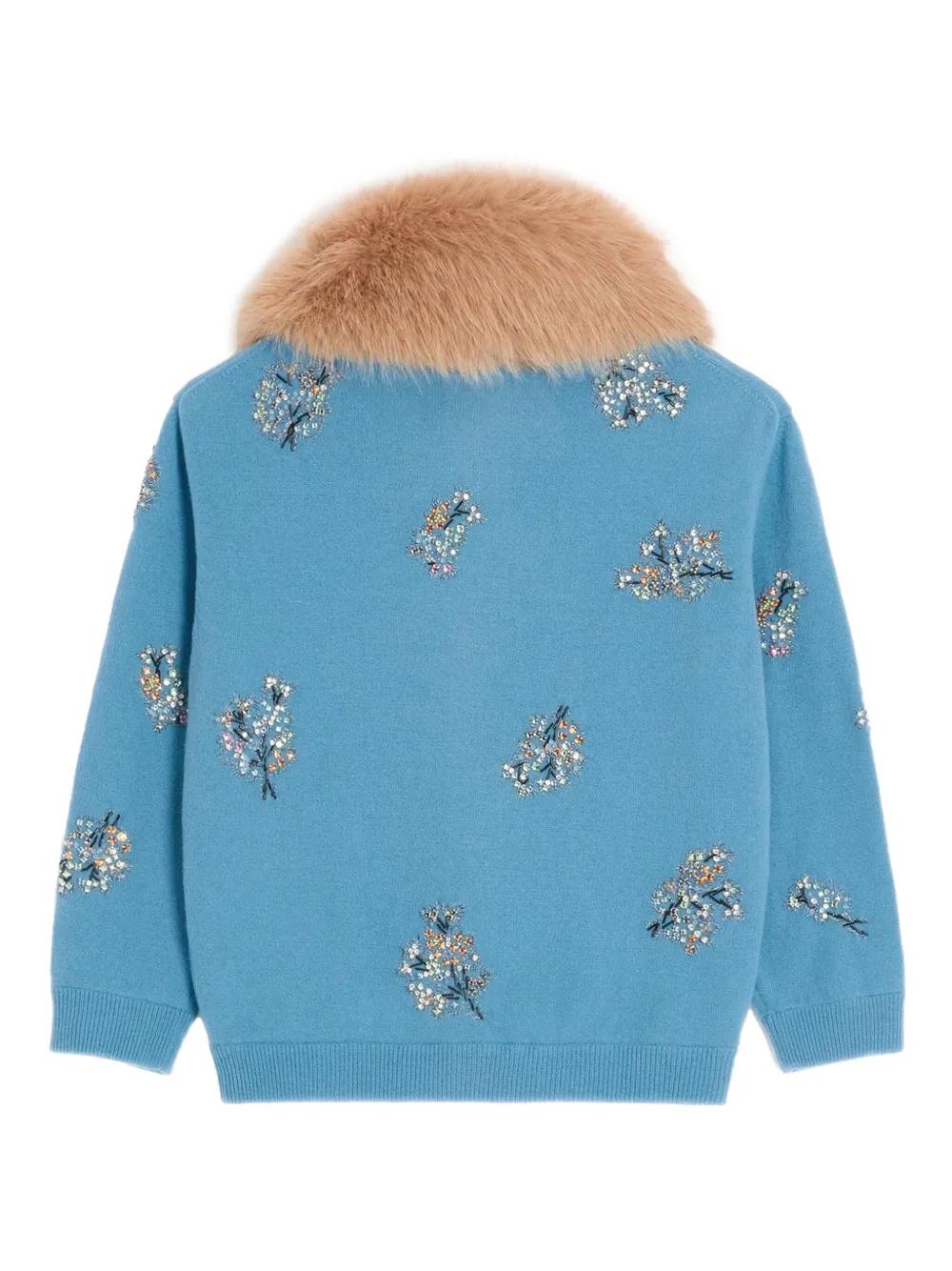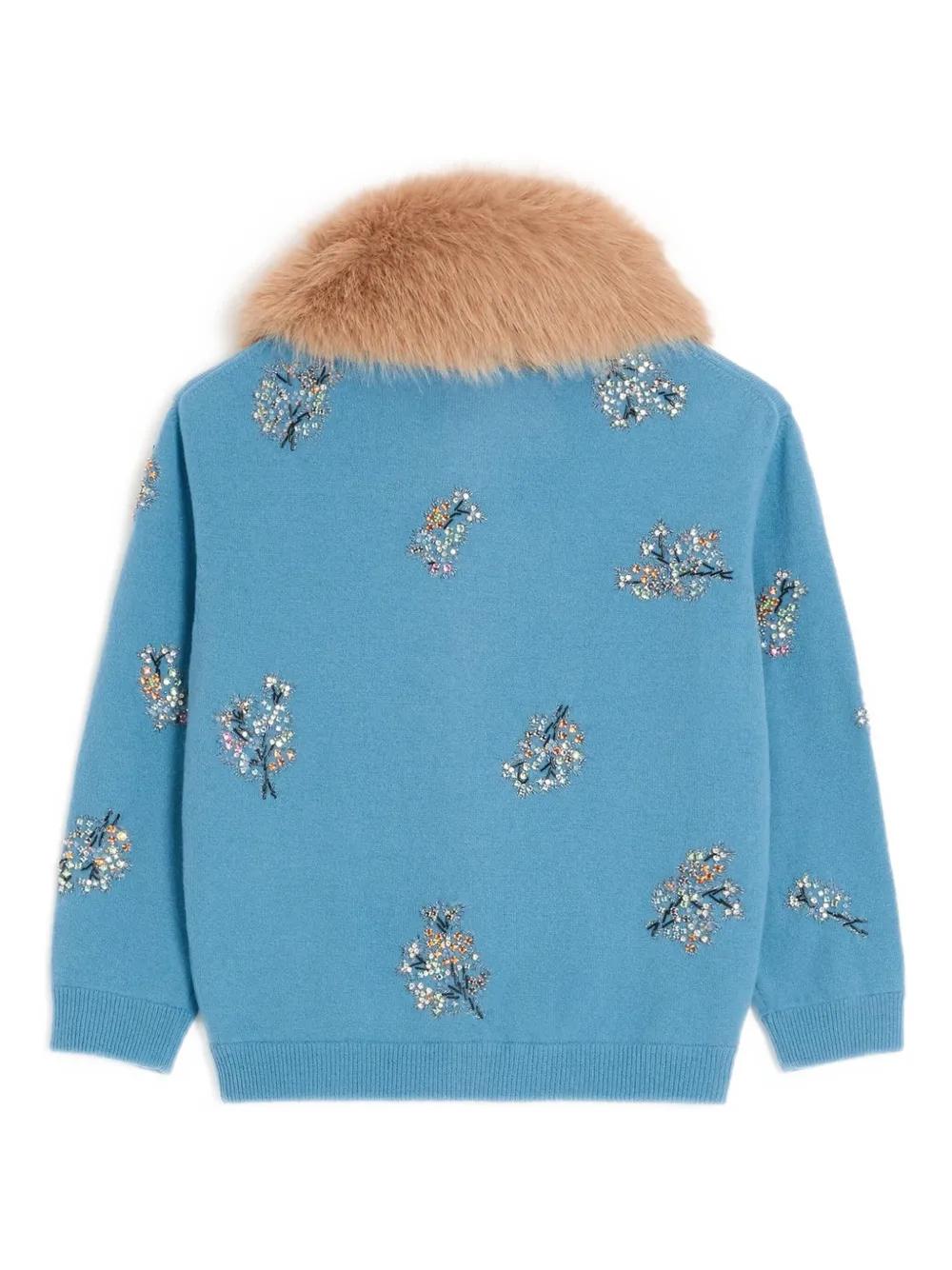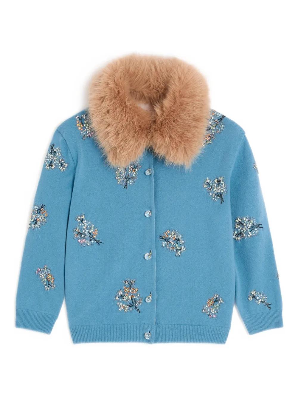 blue buttons-fastening faux-fur collar bead-detail long-sleeves ribbed cuffs and hem jacquard lining crystal buttons