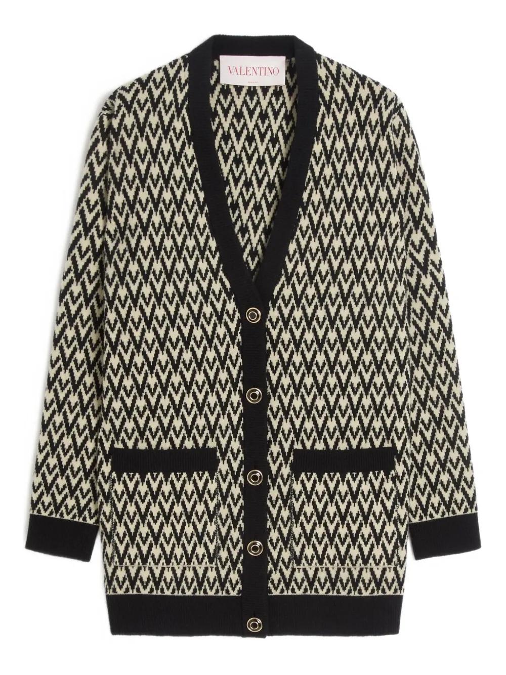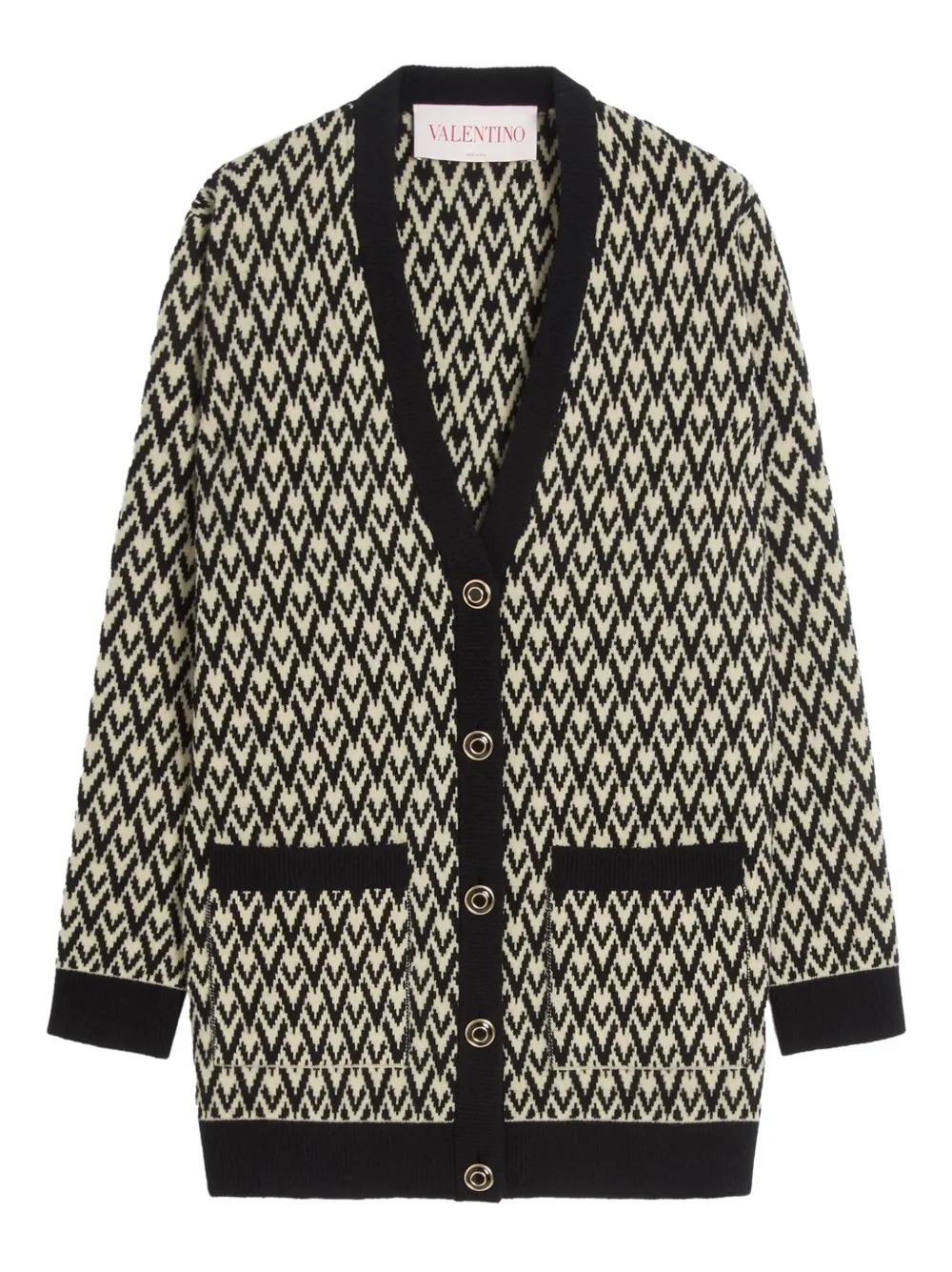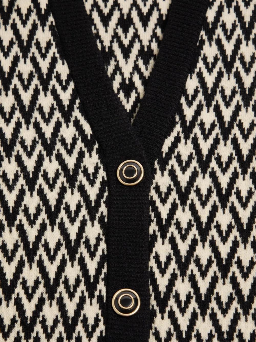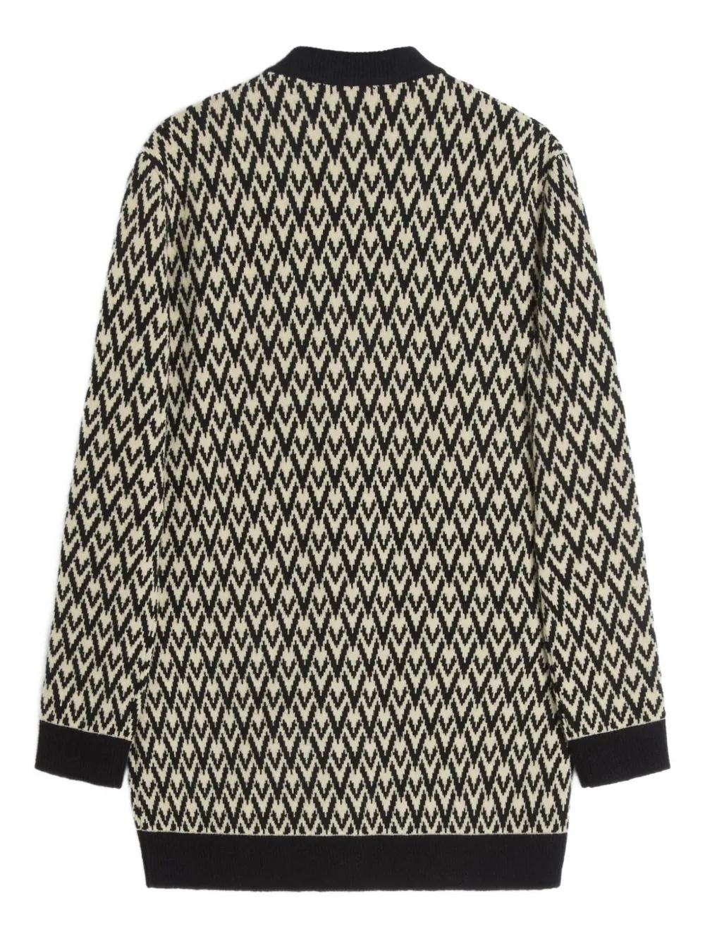 black virgin wool geometric pattern front button fastening V-neck two side patch pockets long sleeves ribbed cuffs and hem contrasting trim