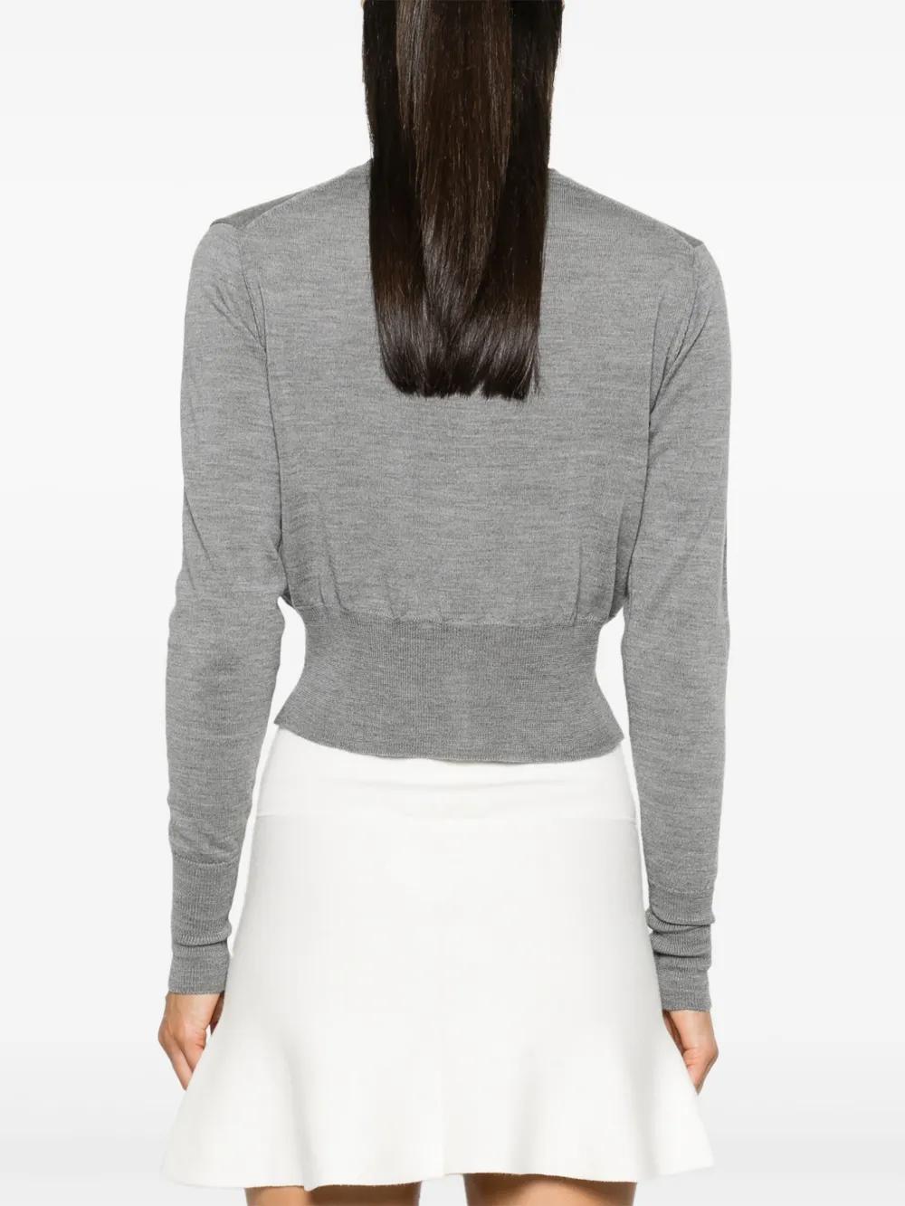 grey virgin wool fine knit mélange effect front button fastening ribbed trim crew neck long sleeves embroidered logo at the chest straight hem cropped