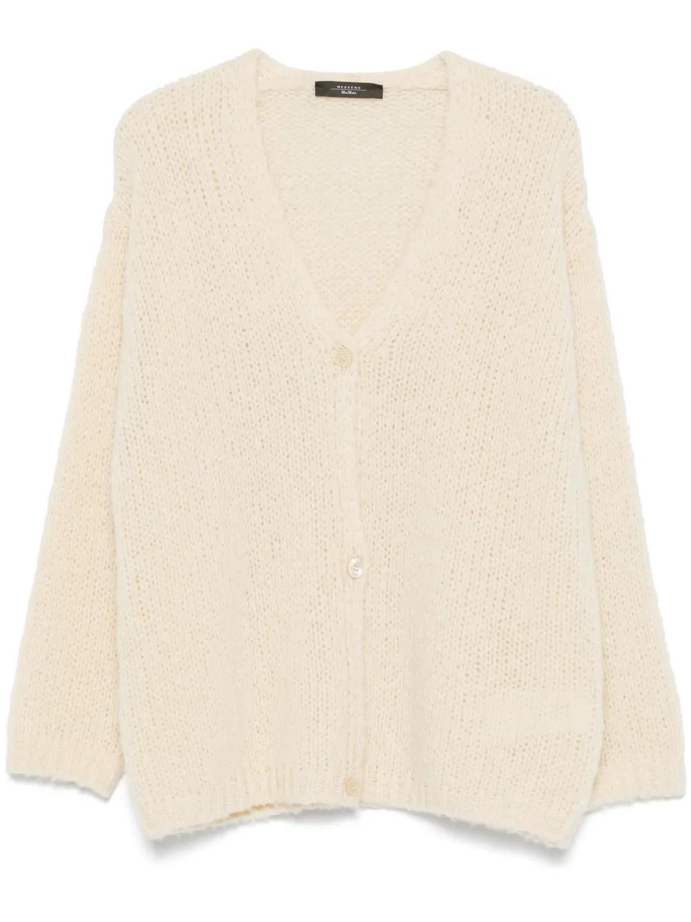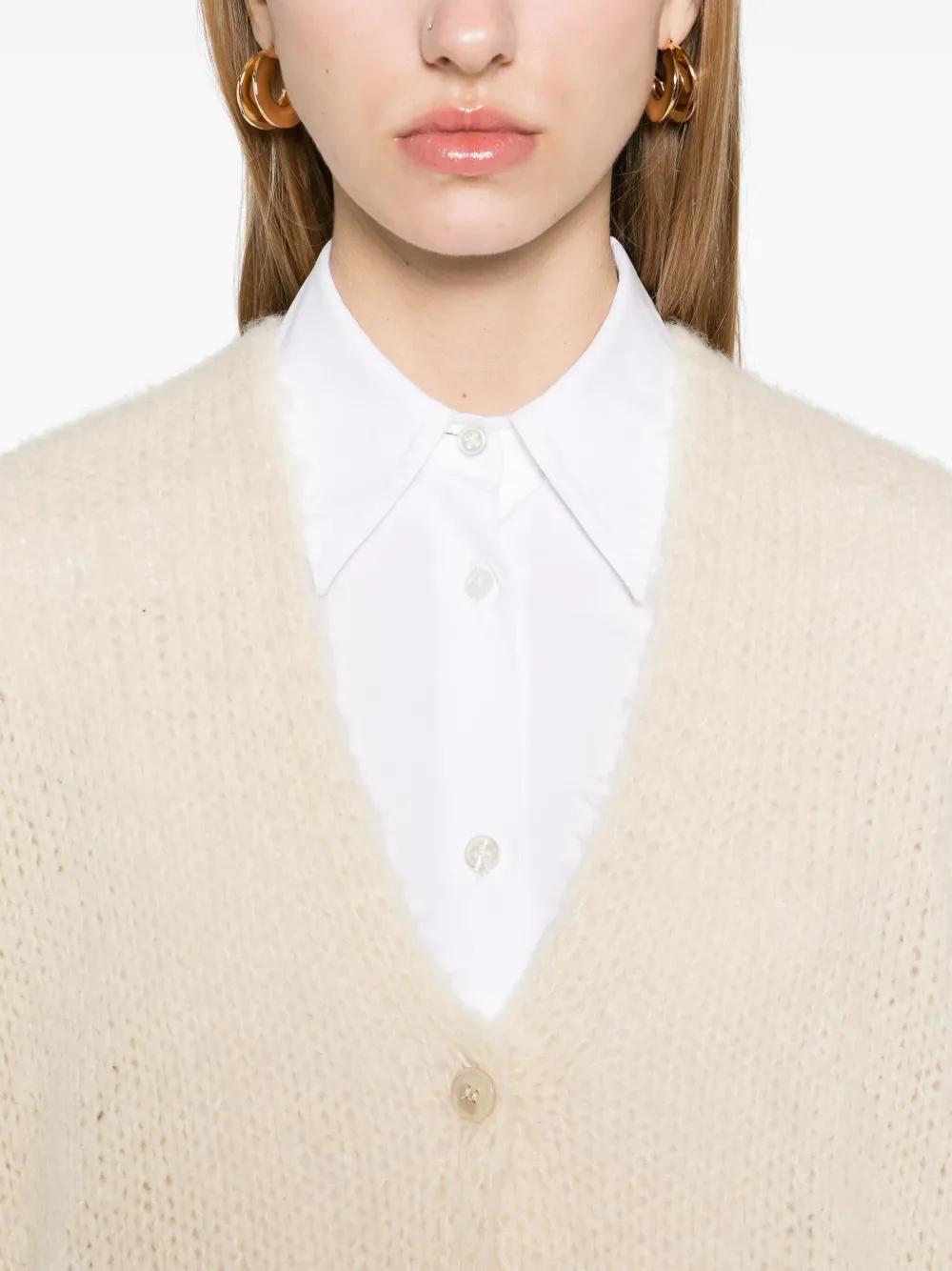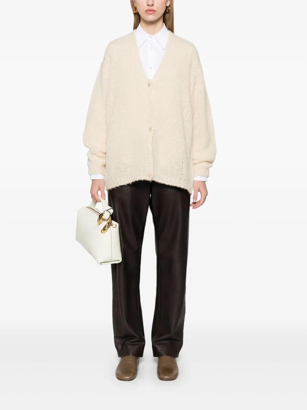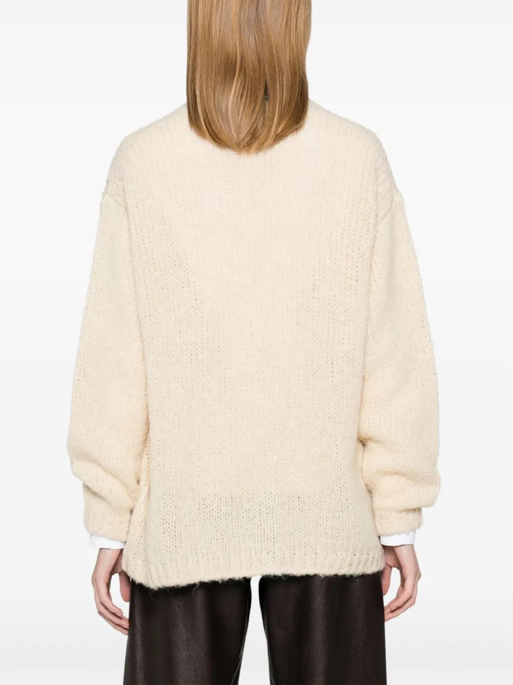 cream white chunky knit front button placket plunging V-neck drop shoulder long sleeves mother-of-pearl buttons ribbed cuffs and hem