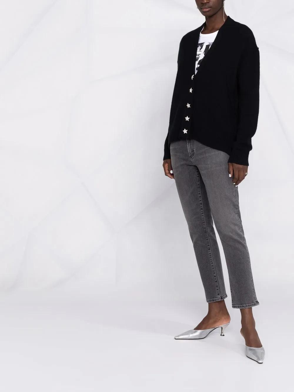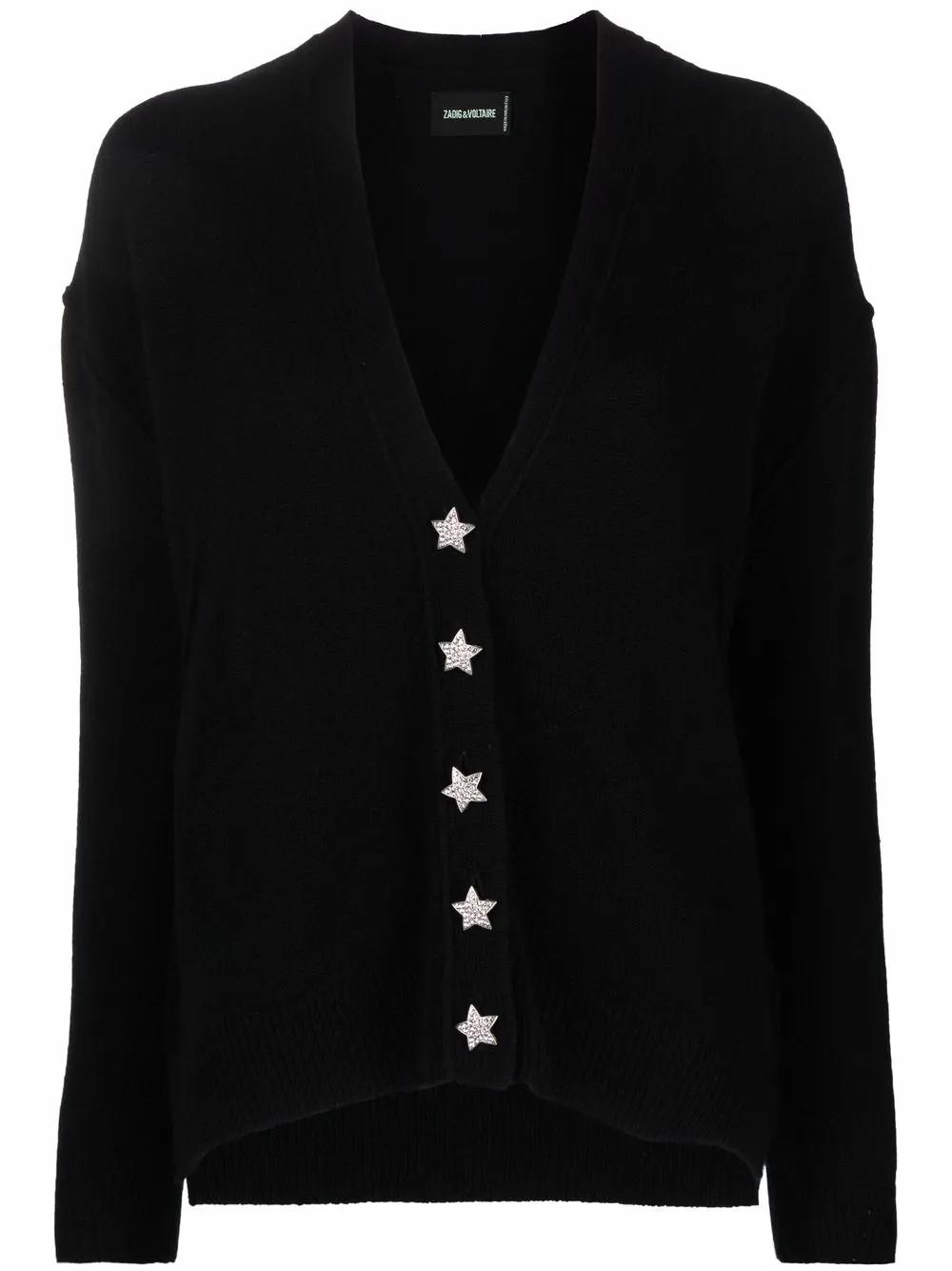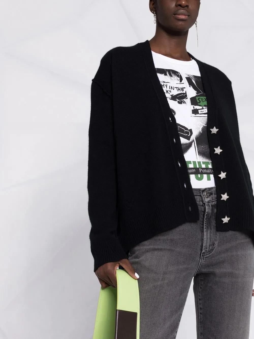 black cashmere knitted construction star stud detailing drop shoulder long sleeves V-neck straight hem front button fastening