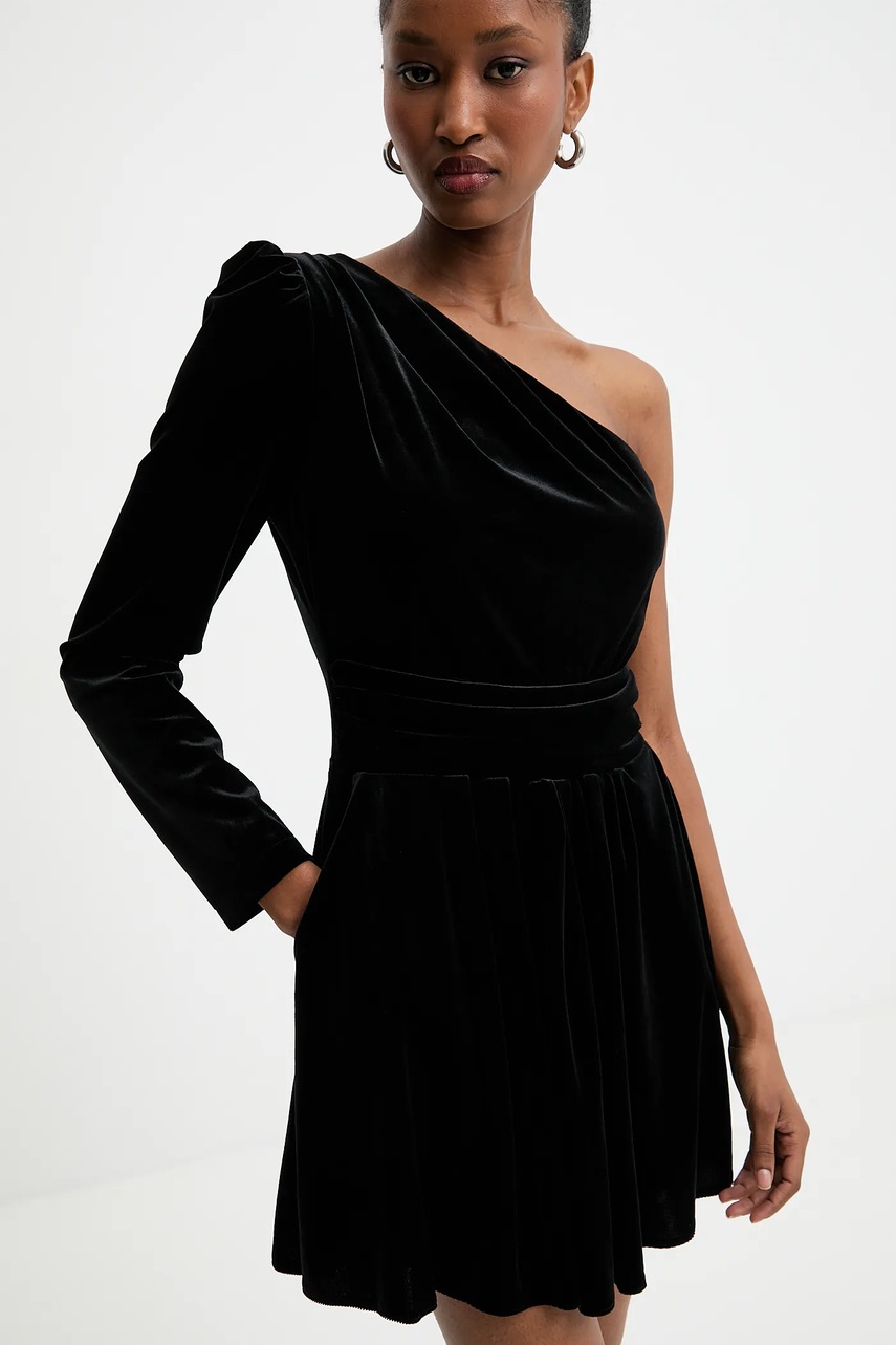 - Model na jedno ramię. - Długi, bufiasty rękaw. - Asymetryczny dekolt. - Boczne zapięcie na kryty suwak. - Luźna nogawka. - Wbudowane szorty zapewniają dodatkowe krycie i komfort. - Dwie wsuwane kieszenie boczne. - Model z ozdobnymi marszczeniami. - Cienka, nieelastyczna tkanina. - Długość: 80 cm. - Szerokość pod pachami: 42 cm. - Szerokość w pasie: 33 cm. - Szerokość w biodrach: 60 cm. - Wysokość stanu: 30 cm. - Szerokość nogawki: 34 cm. - Długość zewnętrzna nogawki: 44 cm. - Wymiary podane dla rozmiaru: S.