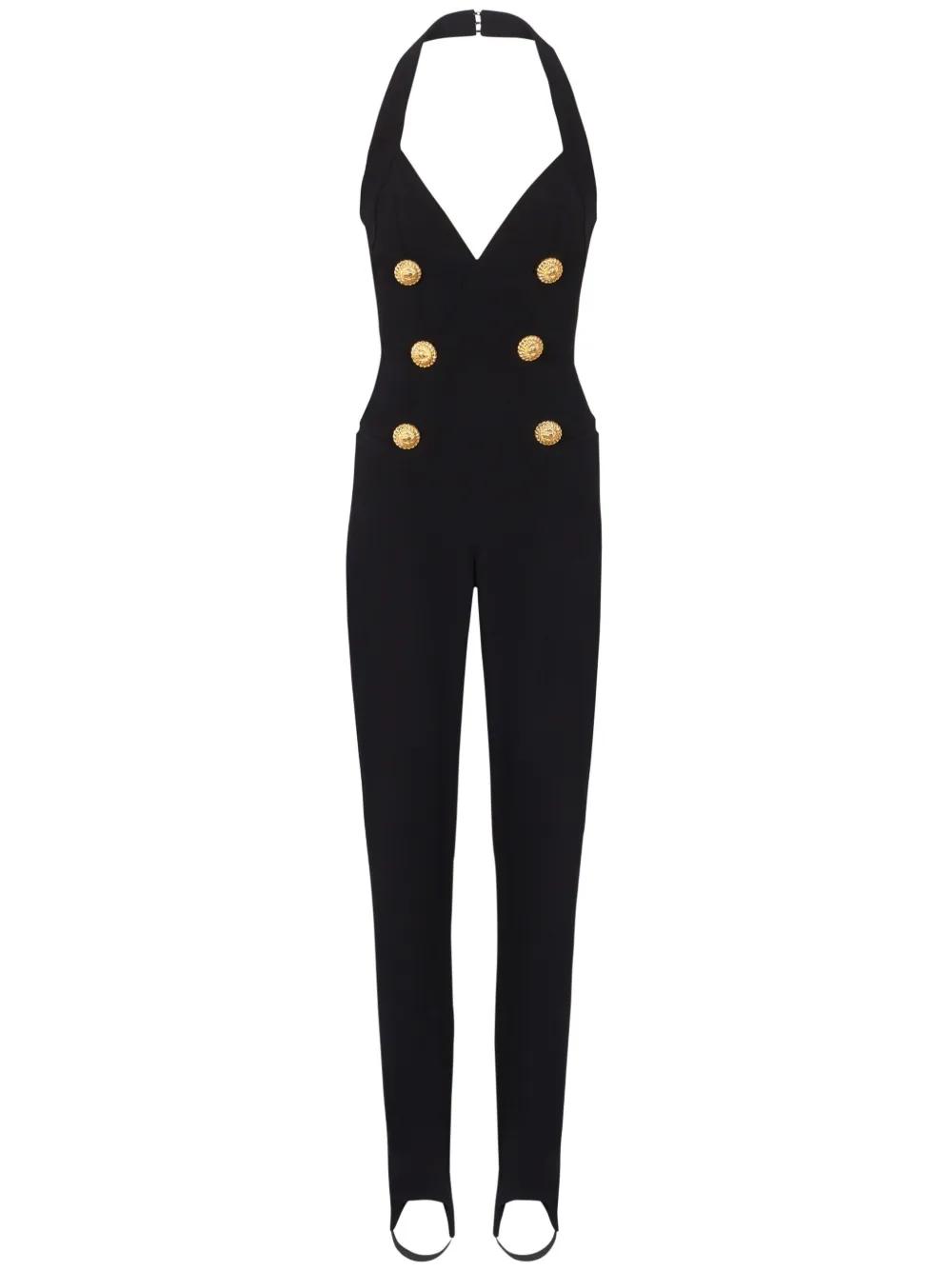 black crepe texture decorative button detailing lion head motif halterneck rear hook fastening concealed rear zip fastening two side slash pockets stirrup cuffs