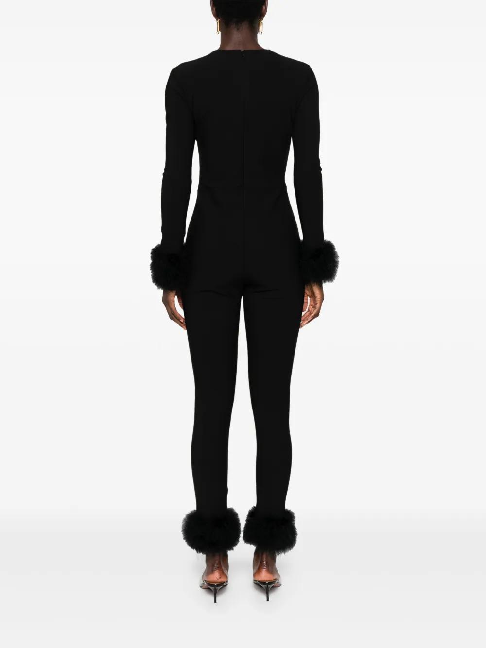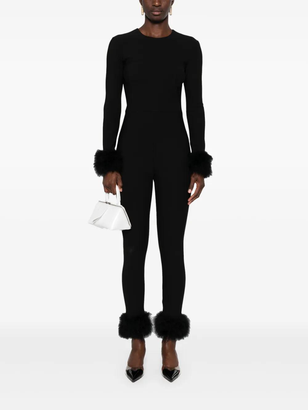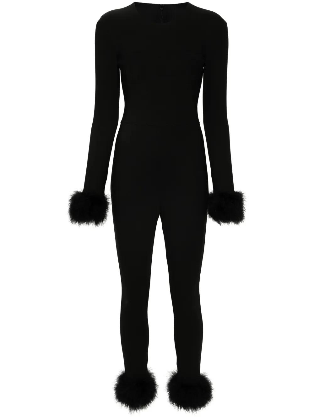 black crepe texture stretch-design feather-trim detailing dart detailing round neck concealed rear hook and zip fastening long sleeves fitted waistline straight leg skinny cut