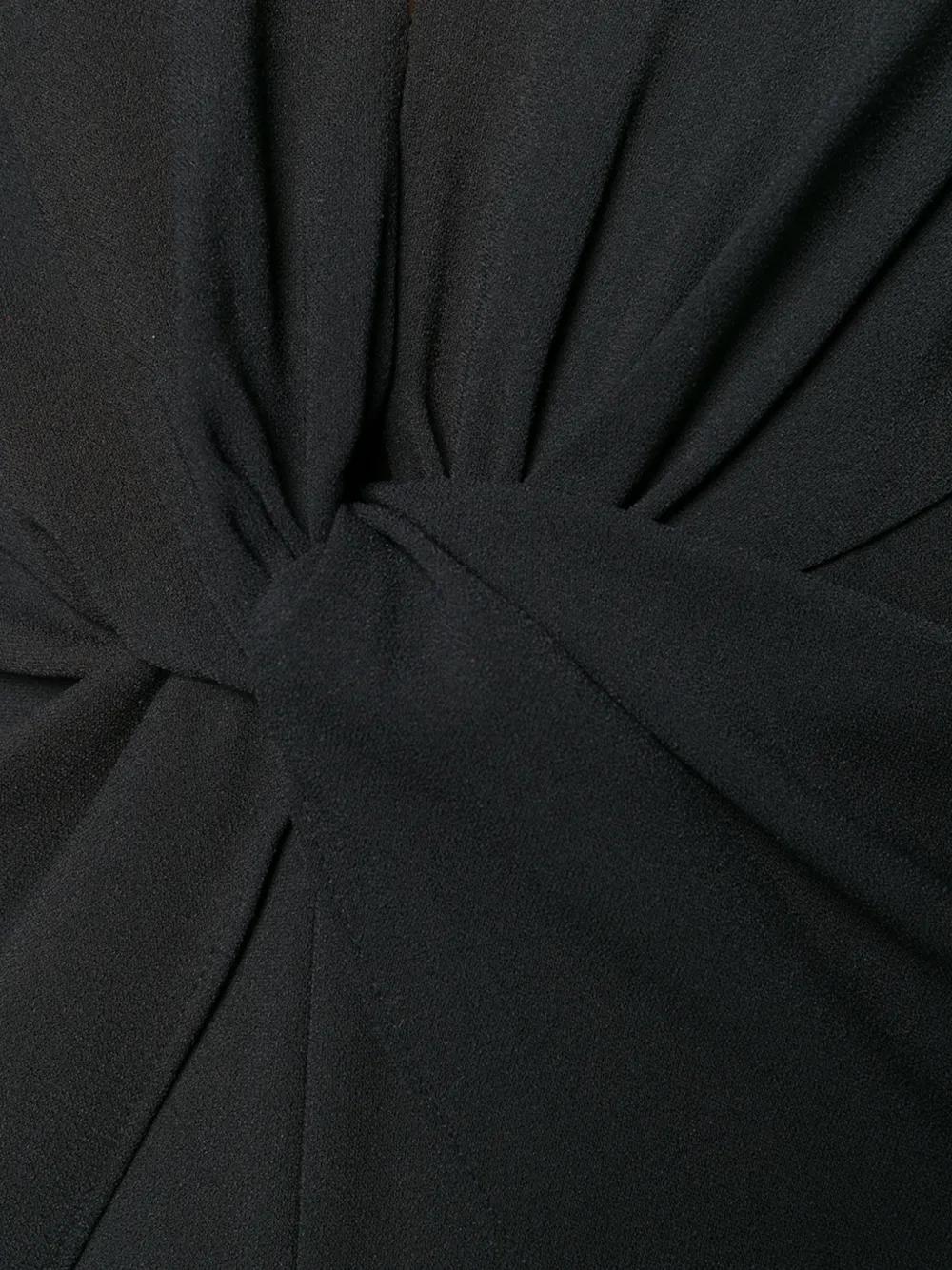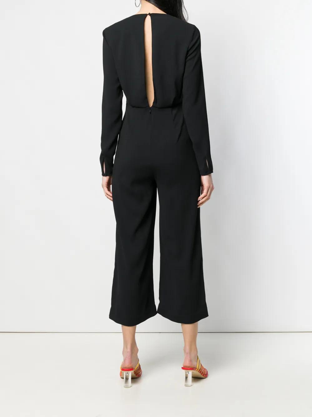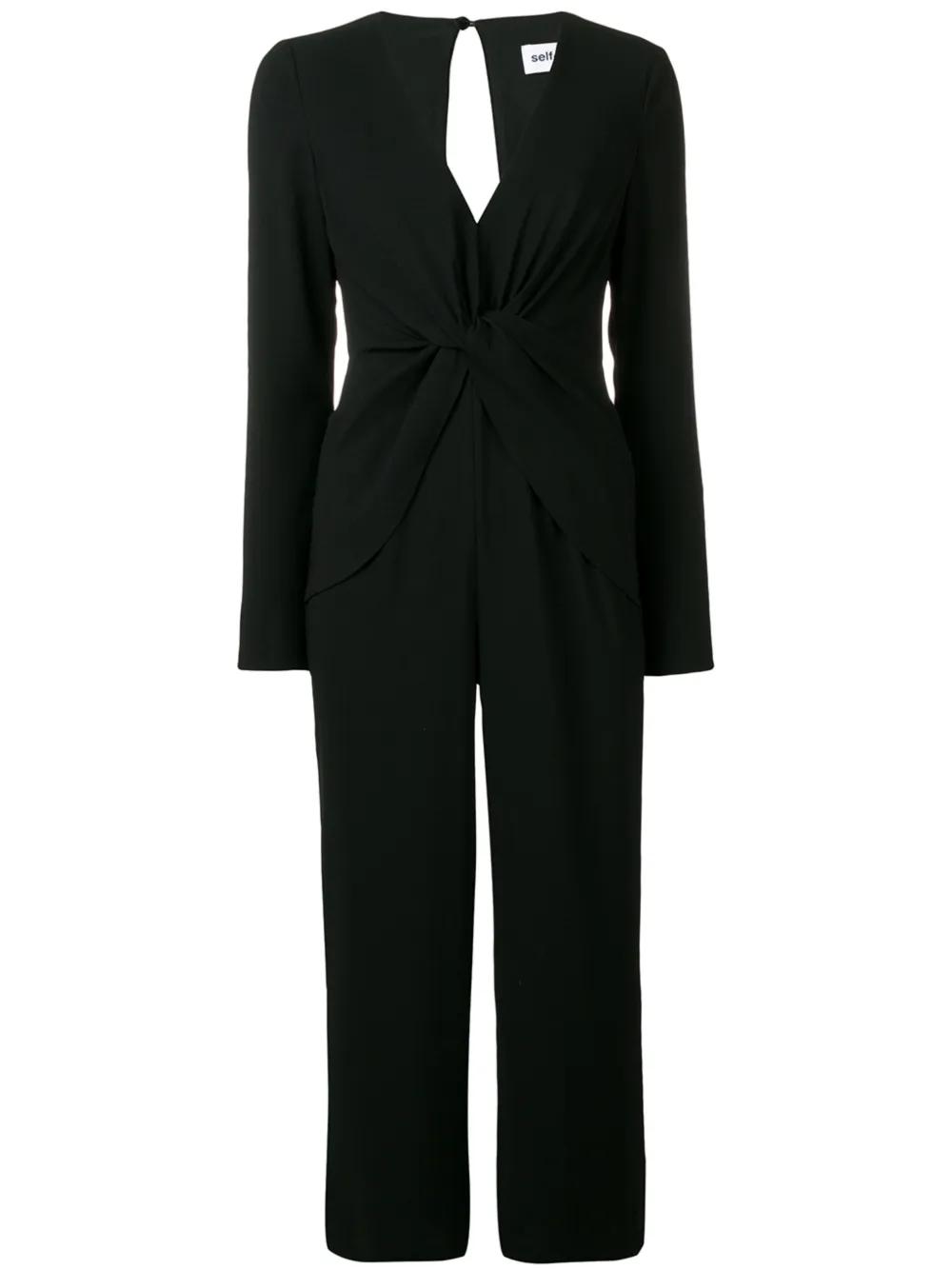 Black knot front jumpsuit from Self-Portrait featuring a sweetheart neckline, a relaxed fit, a cropped length, a back button fastening, a back cutout detail, a rear zip fastening and long sleeves.