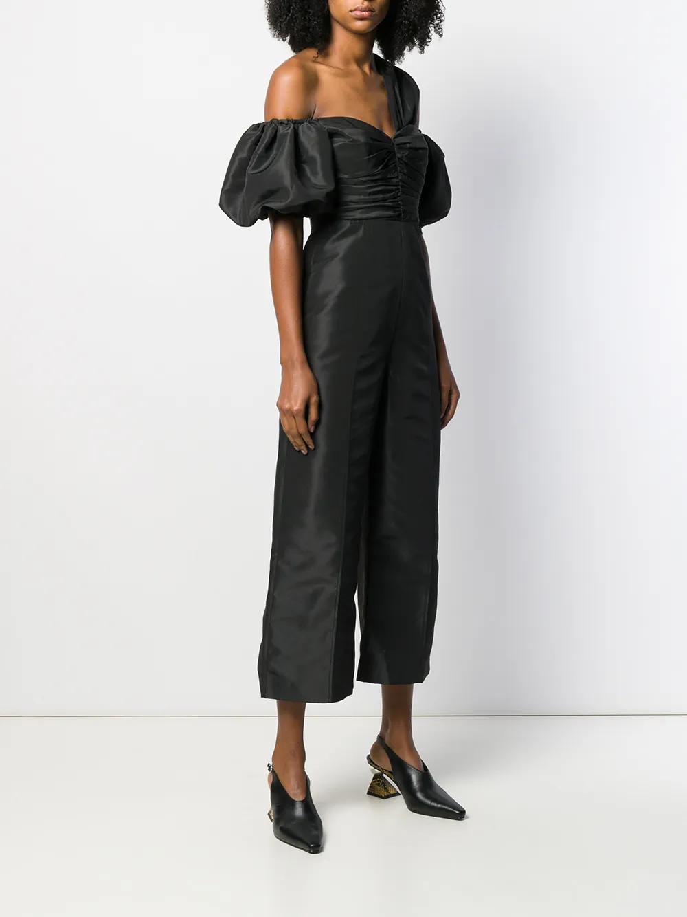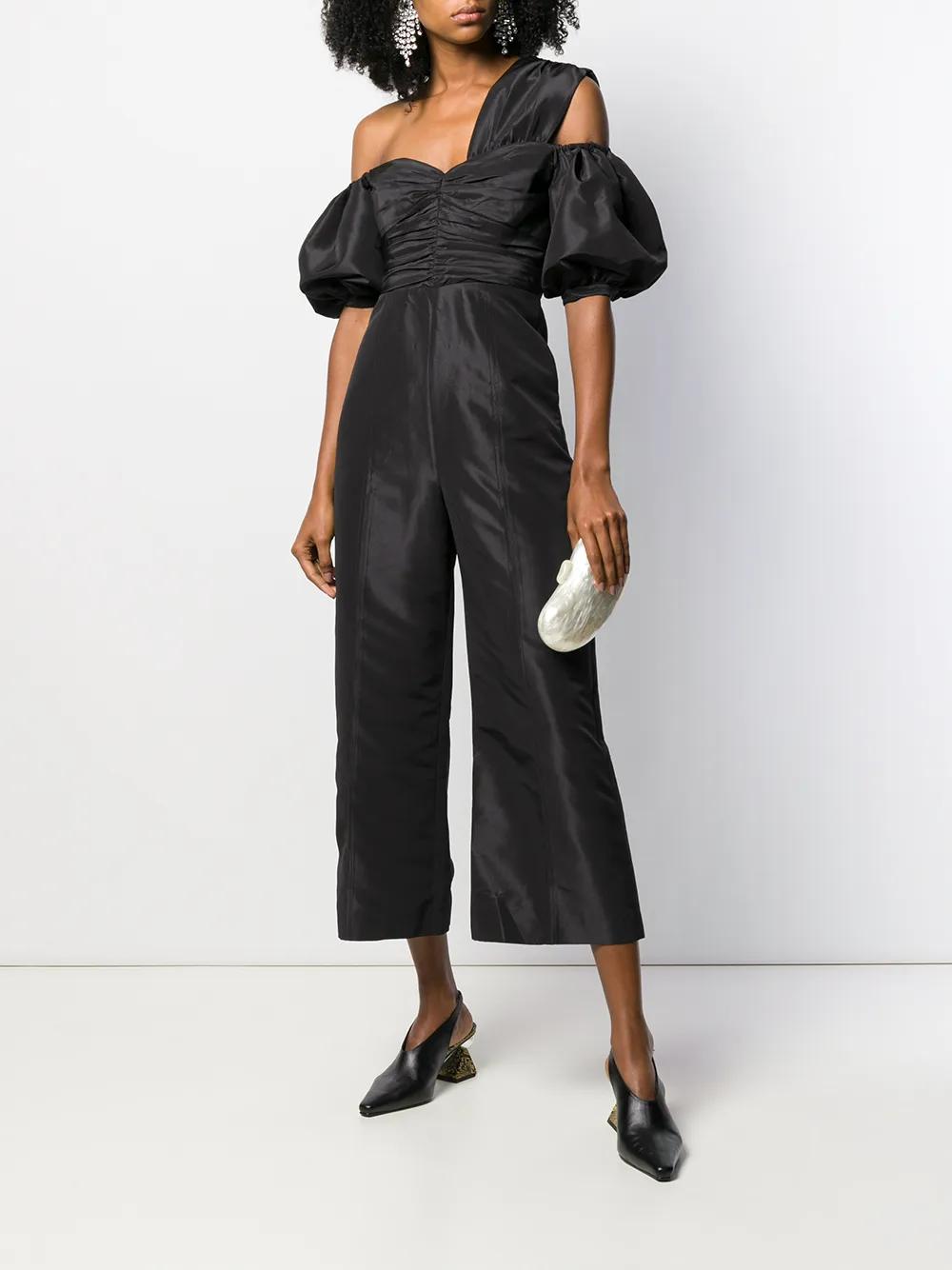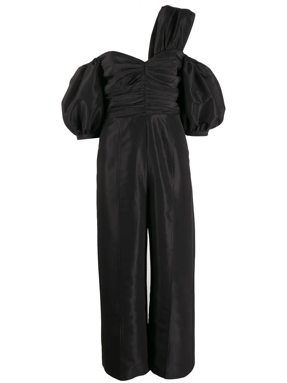 Black one shoulder jumpsuit from Self-Portrait featuring a one shoulder design, a fitted waist and a tailored design.