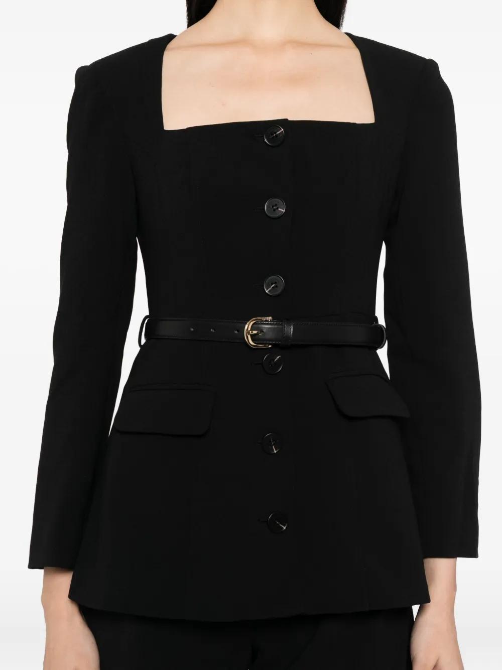 black front button fastening concealed side hook and zip fastening shoulder pads detachable and adjustable waist belt
