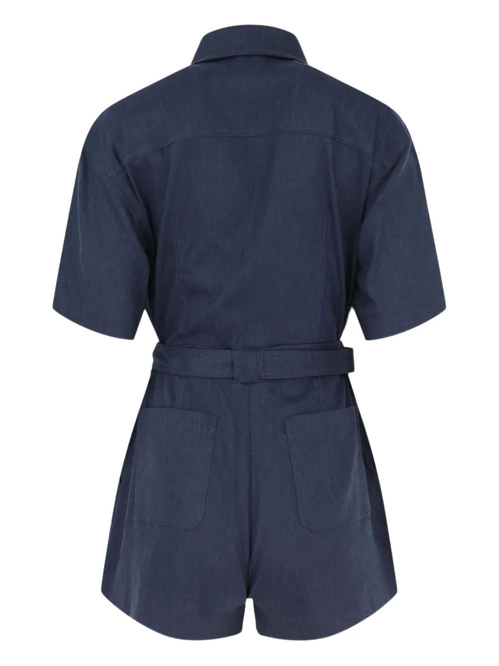 navy blue short sleeves classic collar belted waist two chest pockets two rear pockets