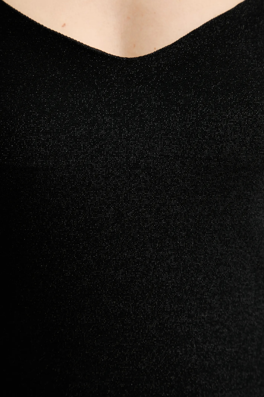 - Dopasowana góra i luźny dół. - Ozdobny, spiczasty dekolt. - Komfortowa, elastyczna listwa w pasie.