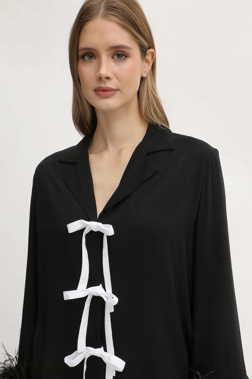 - Luźny krój zapewniający pełną swobodę ruchów. - Model z wiązaniem umożliwiającym regulację. - Model z miękkim kołnierzykiem. - Długi rękaw. - Spodnie luźne w okolicy bioder i ud. - Prosta nogawka na całej długości. - W pasie szeroka, elastyczna listwa.