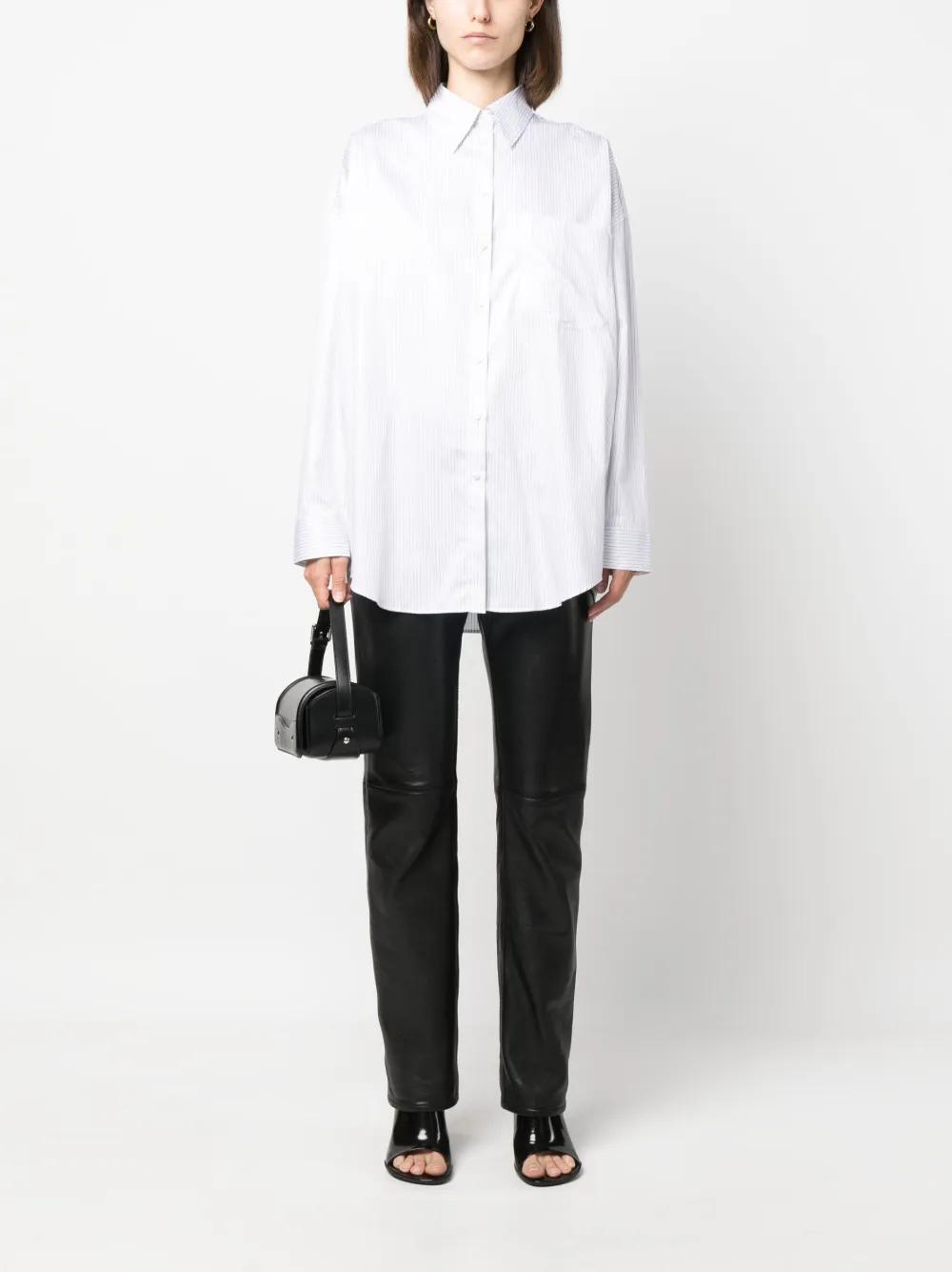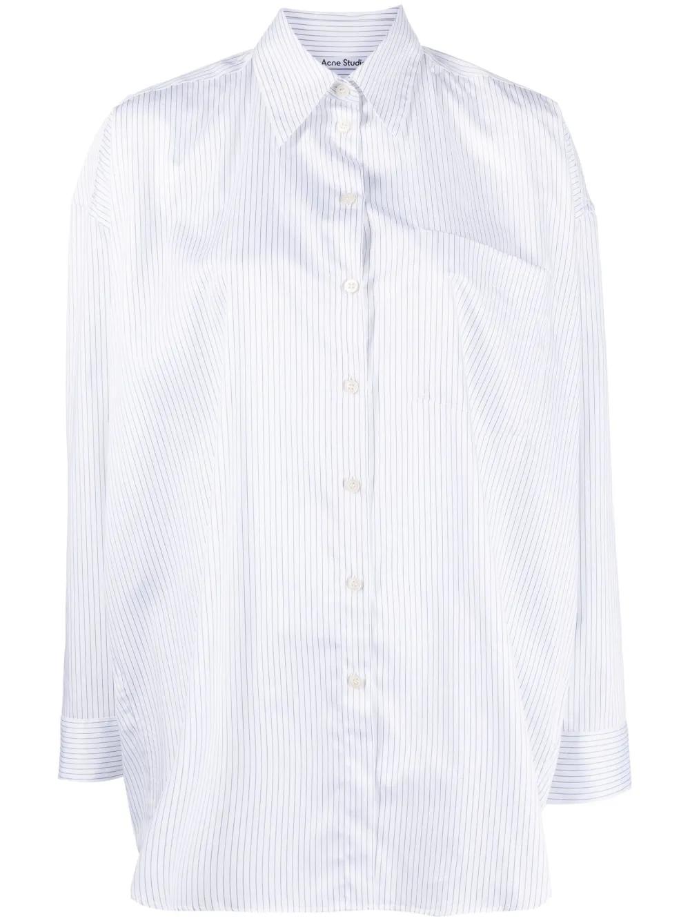 white/navy blue cotton stripe print pointed flat collar front button fastening long sleeves buttoned cuffs curved hem