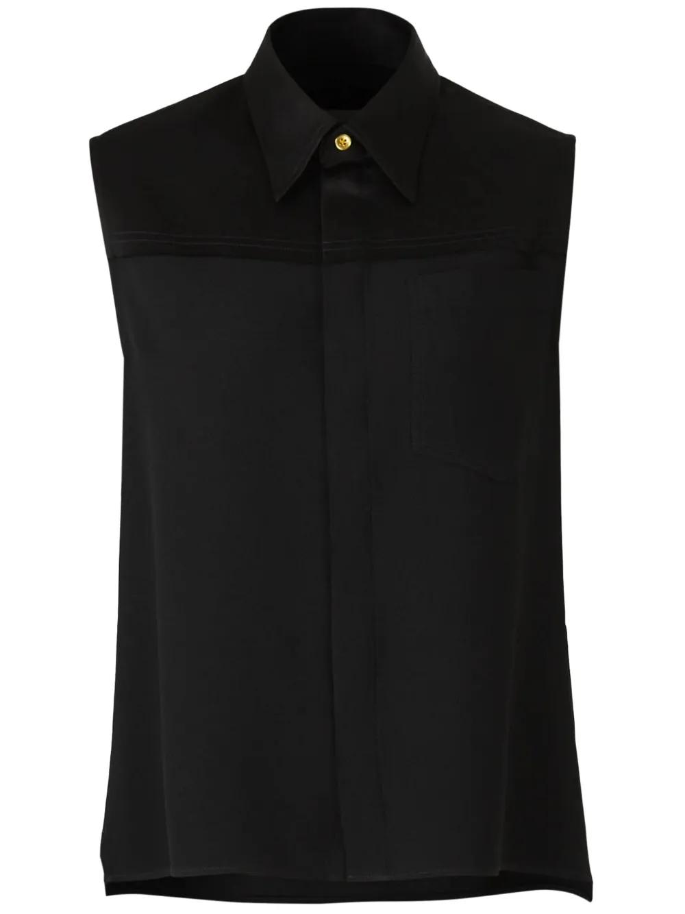 black concealed front button fastening chest patch pocket short side slits pointed flat collar
