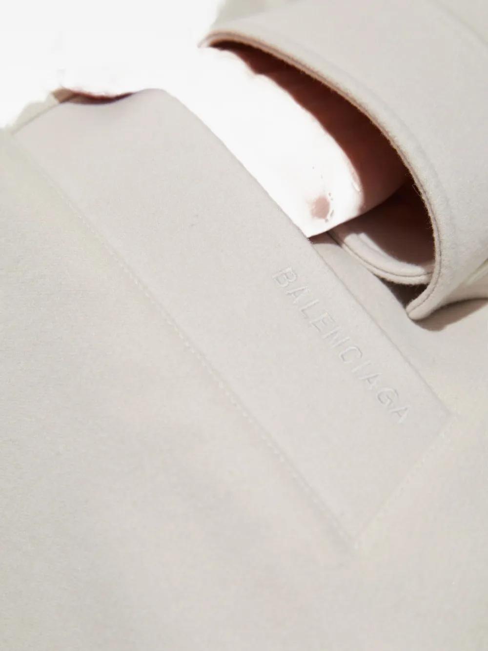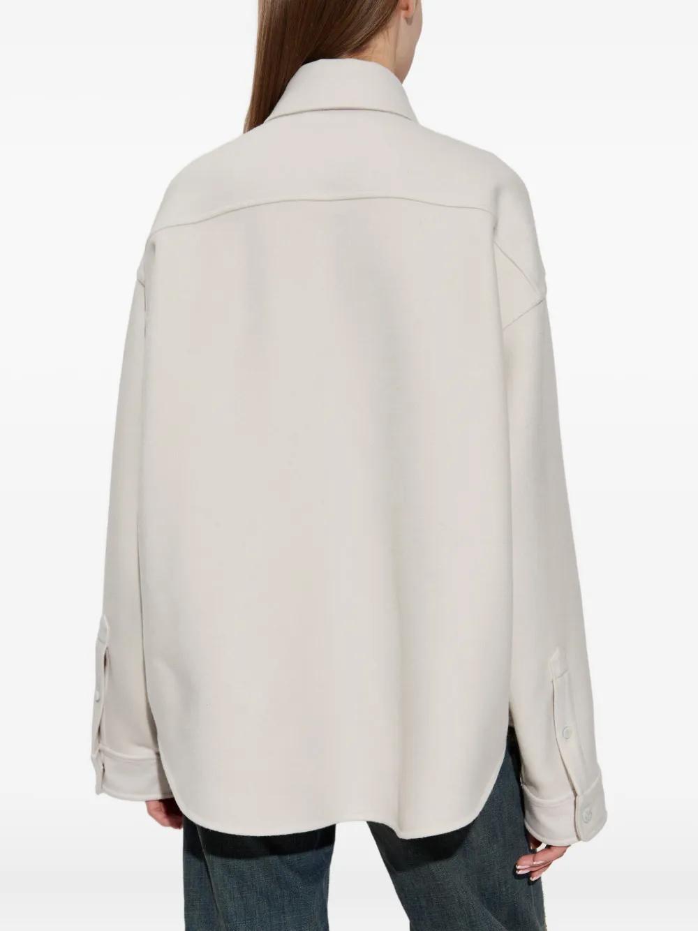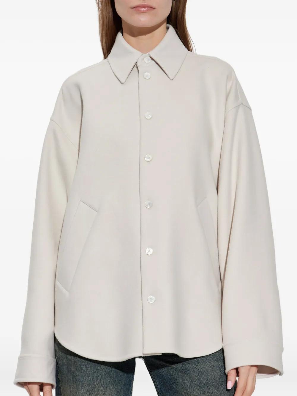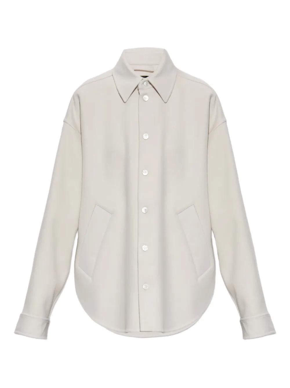 white button fastening welt pockets long sleeves buttoned cuffs curved hem