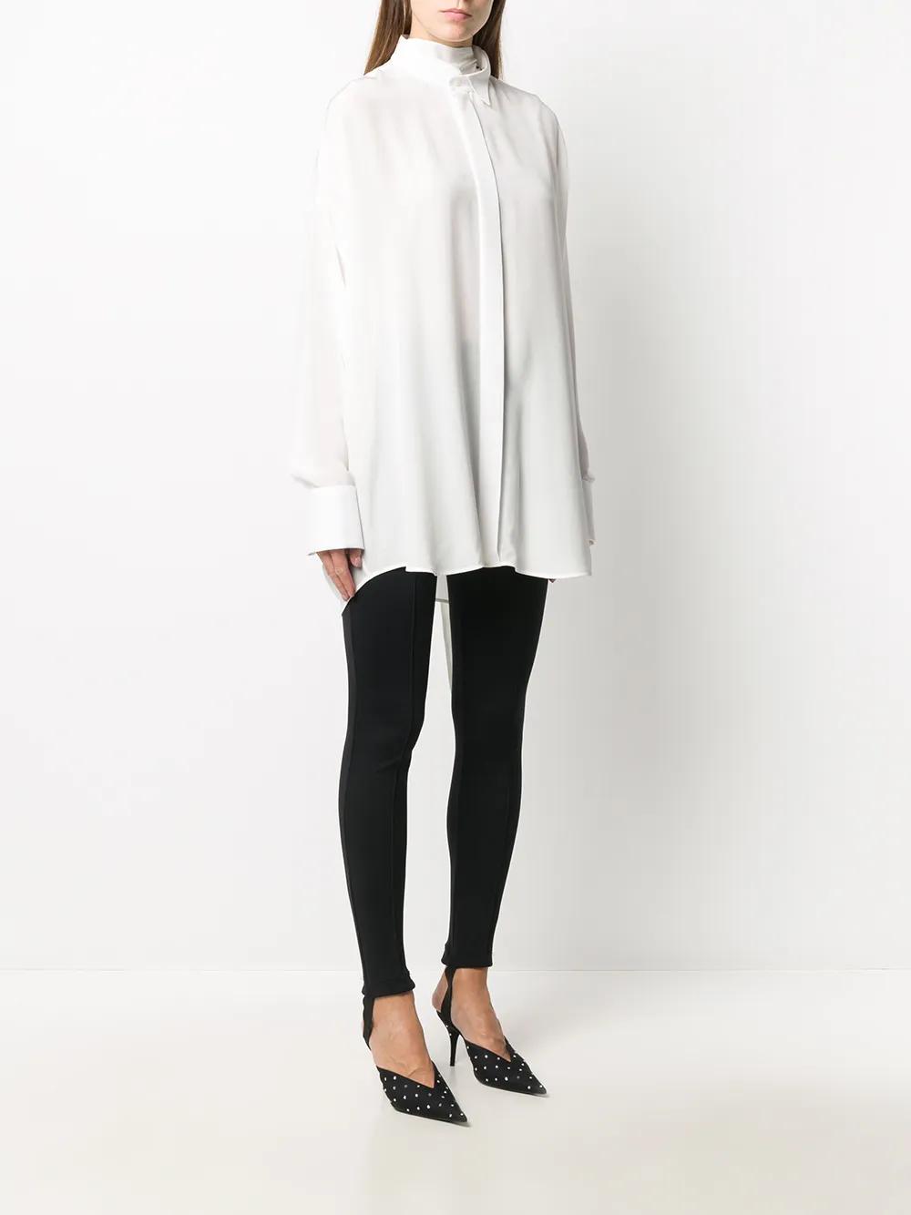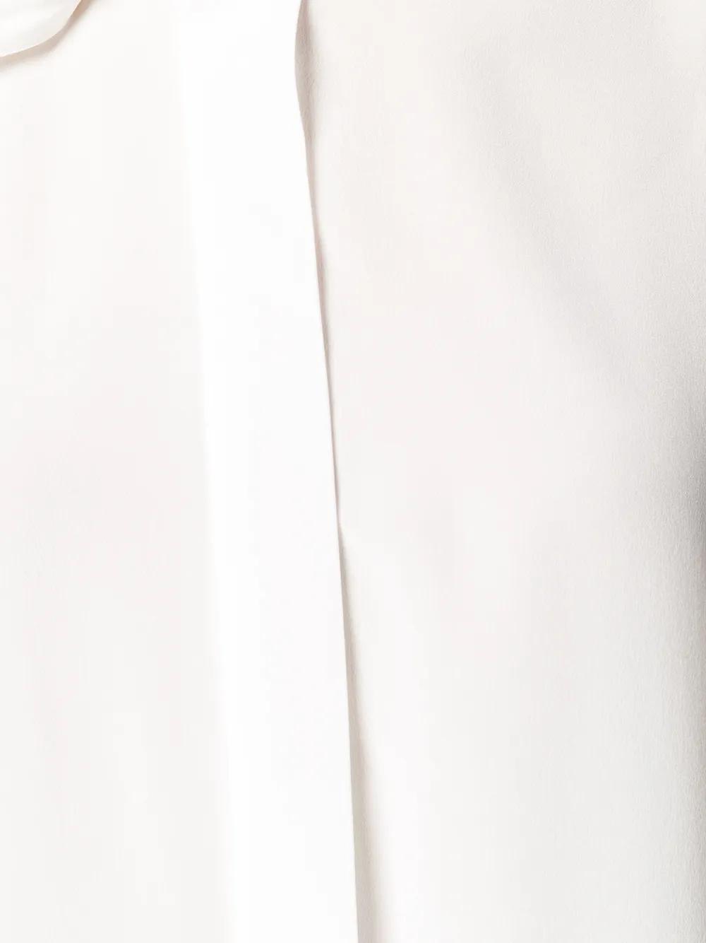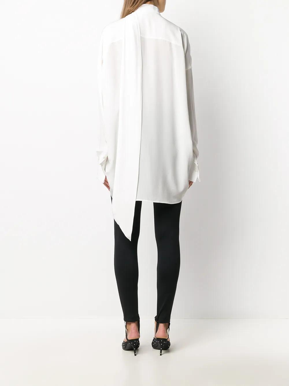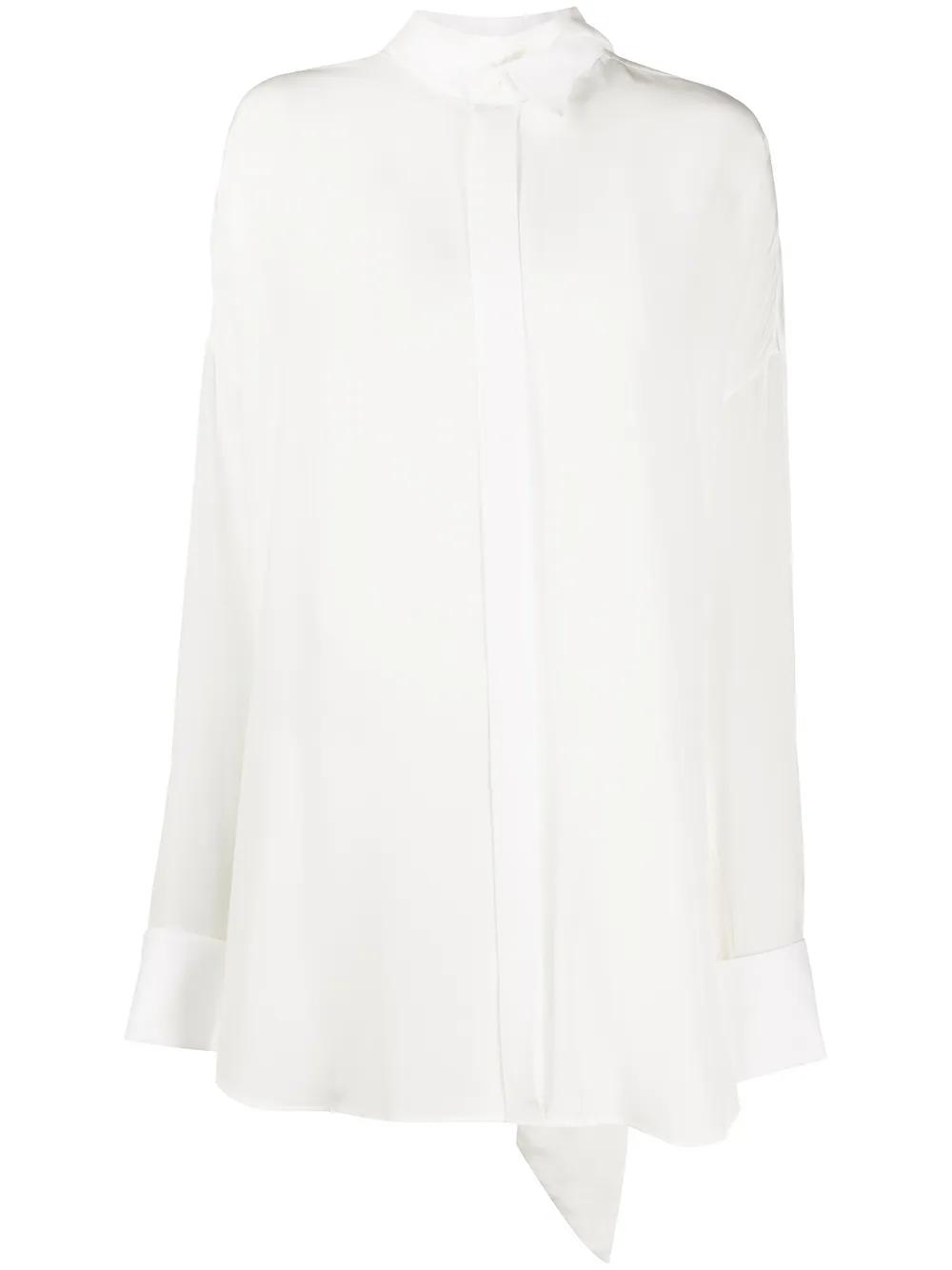 white cotton double collar concealed front button fastening long sleeves tuxedo cuffs scarf detail on the back