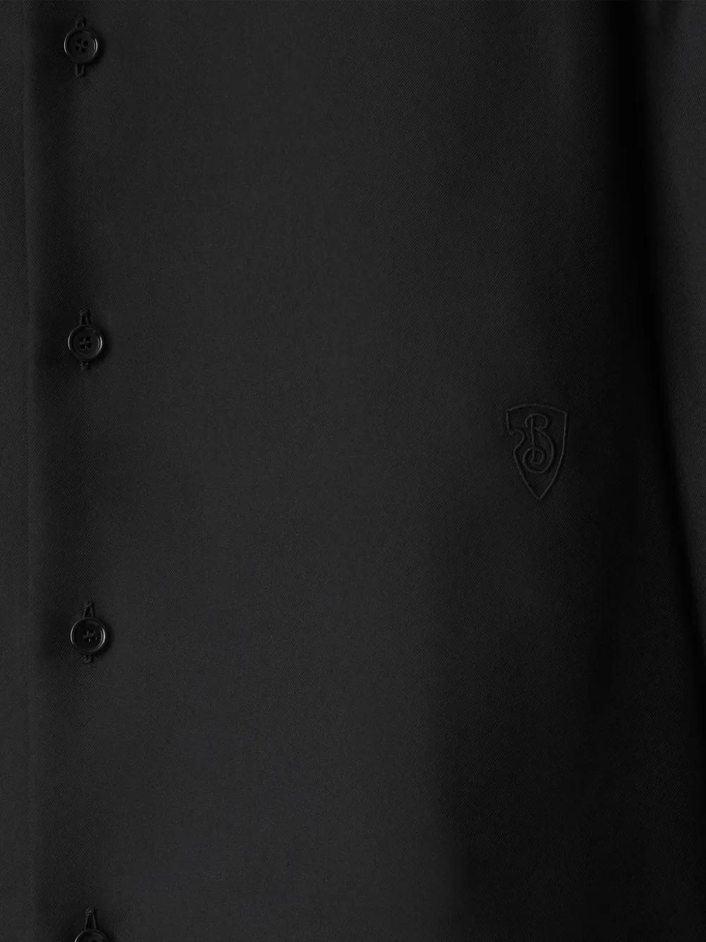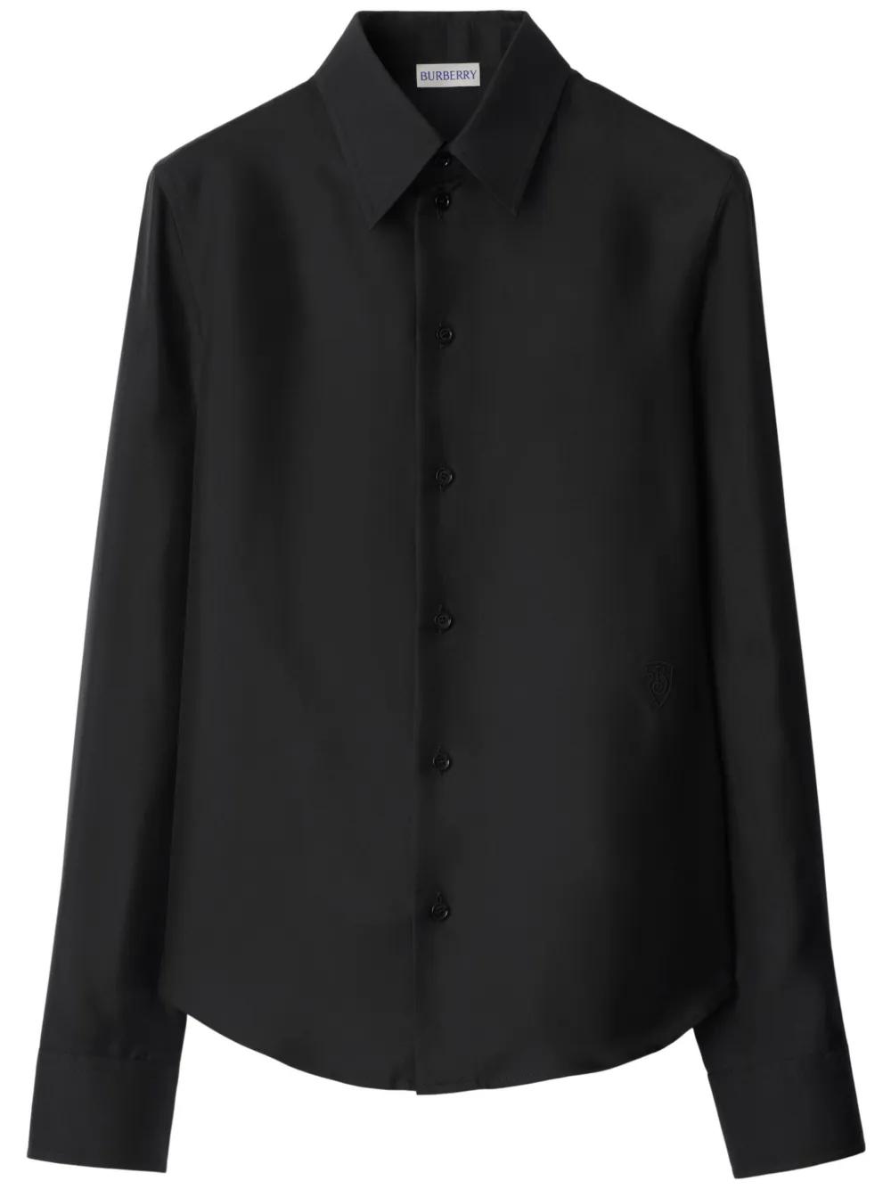 black silk front button fastening long sleeves buttoned cuffs curved hem internal logo patch