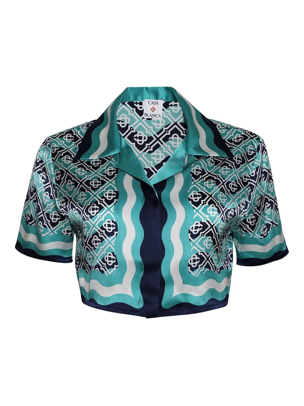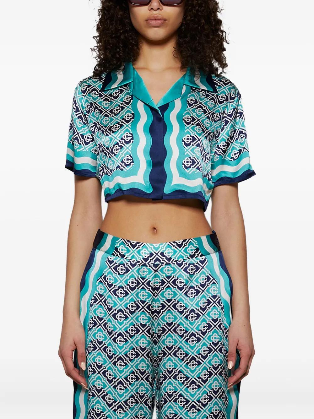 sapphire blue concealed front button fastening Cuban collar short sleeves cropped