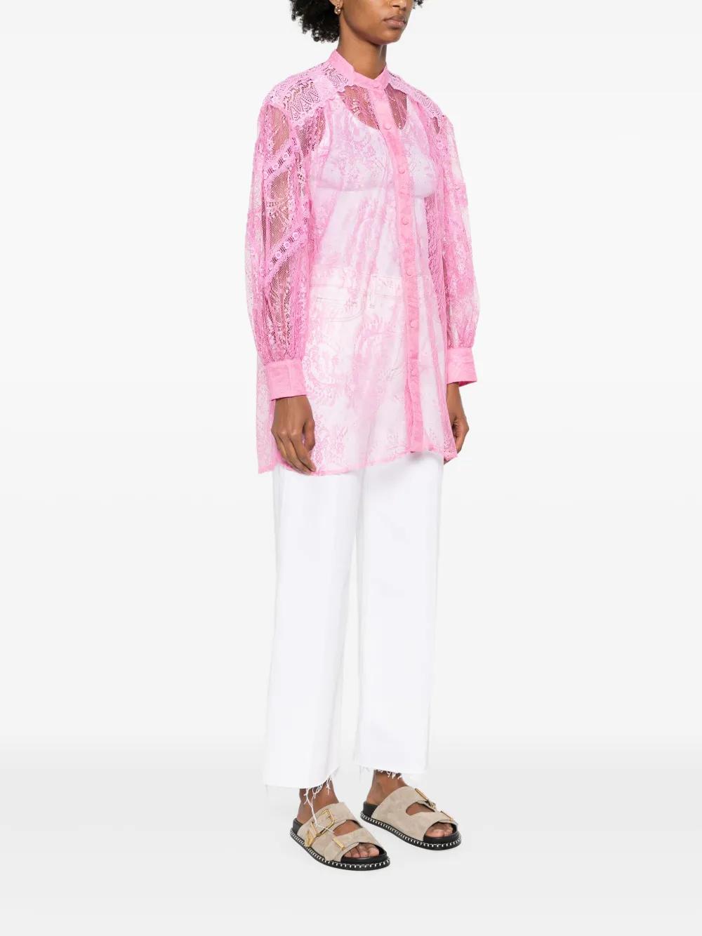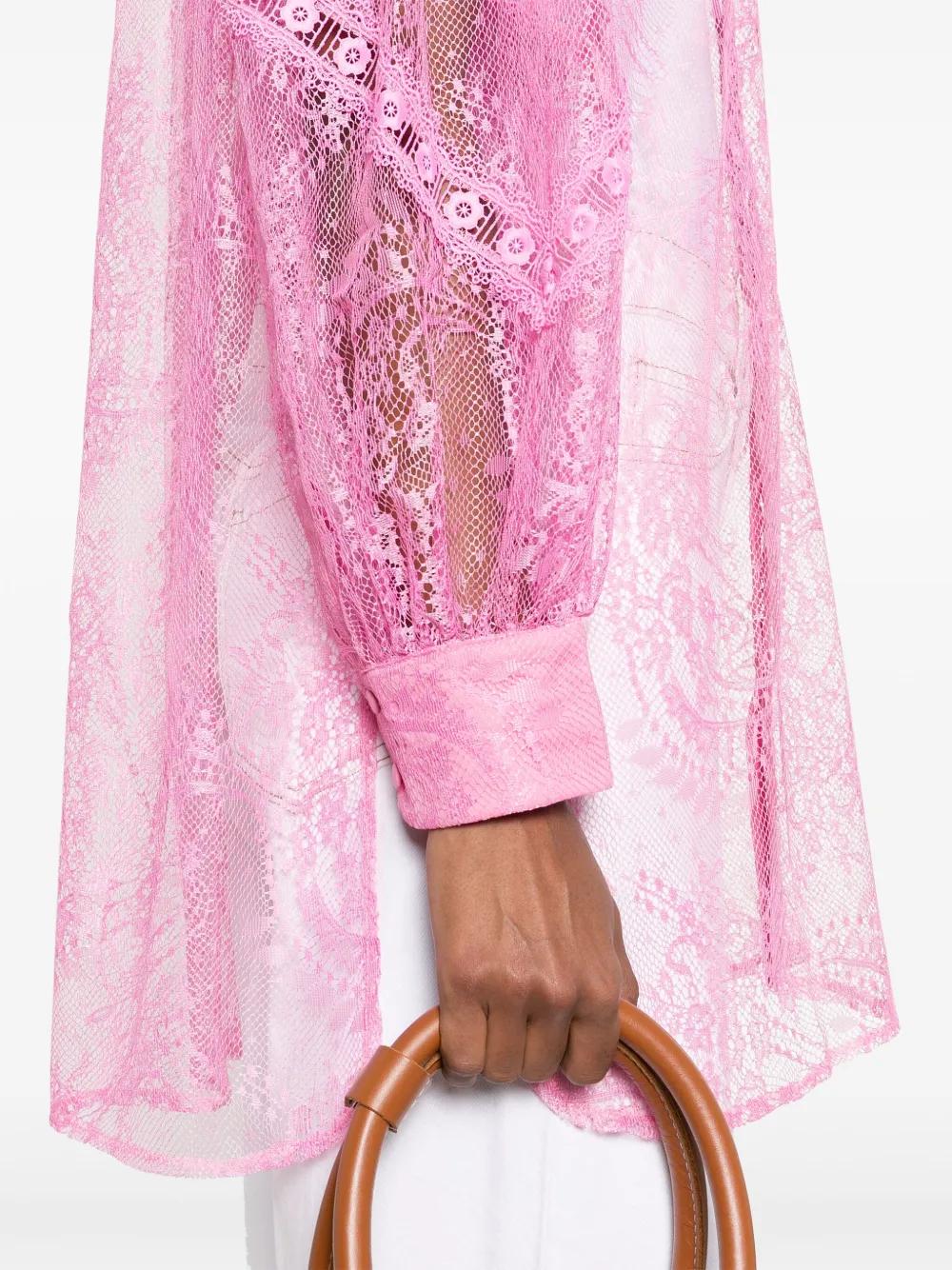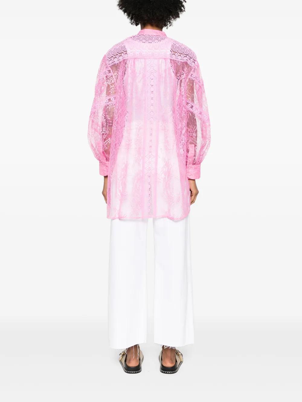 bubblegum pink lace design semi-sheer construction band collar long sleeves buttoned-cuff sleeves straight hem front button fastening