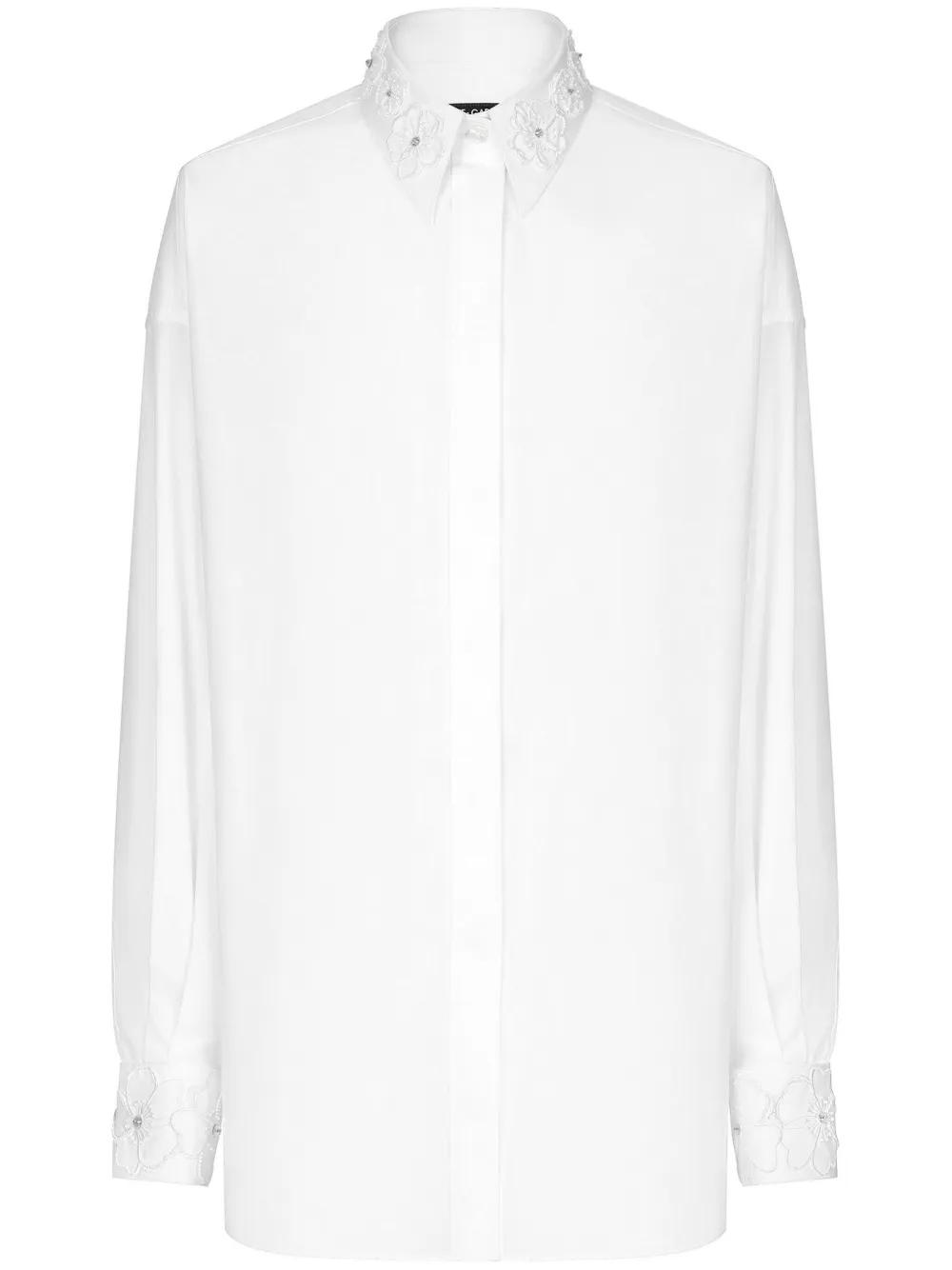 white cotton rhinestone embellishment poplin texture floral embroidery pointed flat collar front button fastening buttoned cuffs straight hem