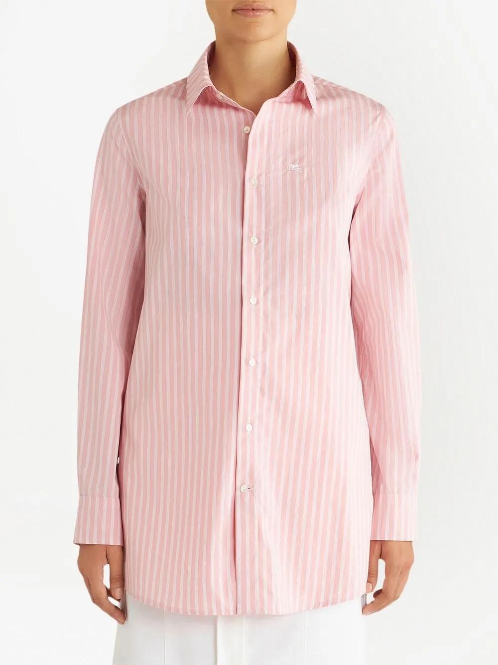 pink cotton pinstripe print button-down collar signature Pegaso motif front button fastening long sleeves buttoned cuffs curved hem