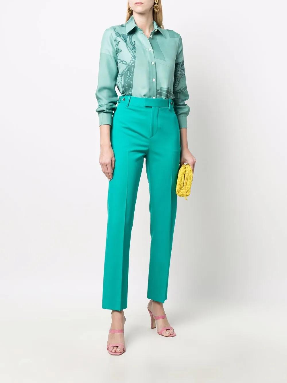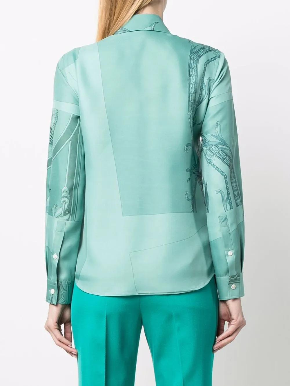 turquoise silk all-over graphic print pointed flat collar front button fastening long sleeves buttoned cuffs curved hem