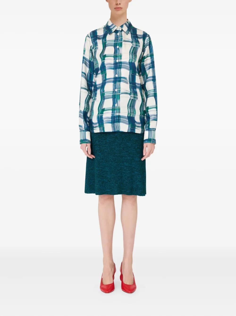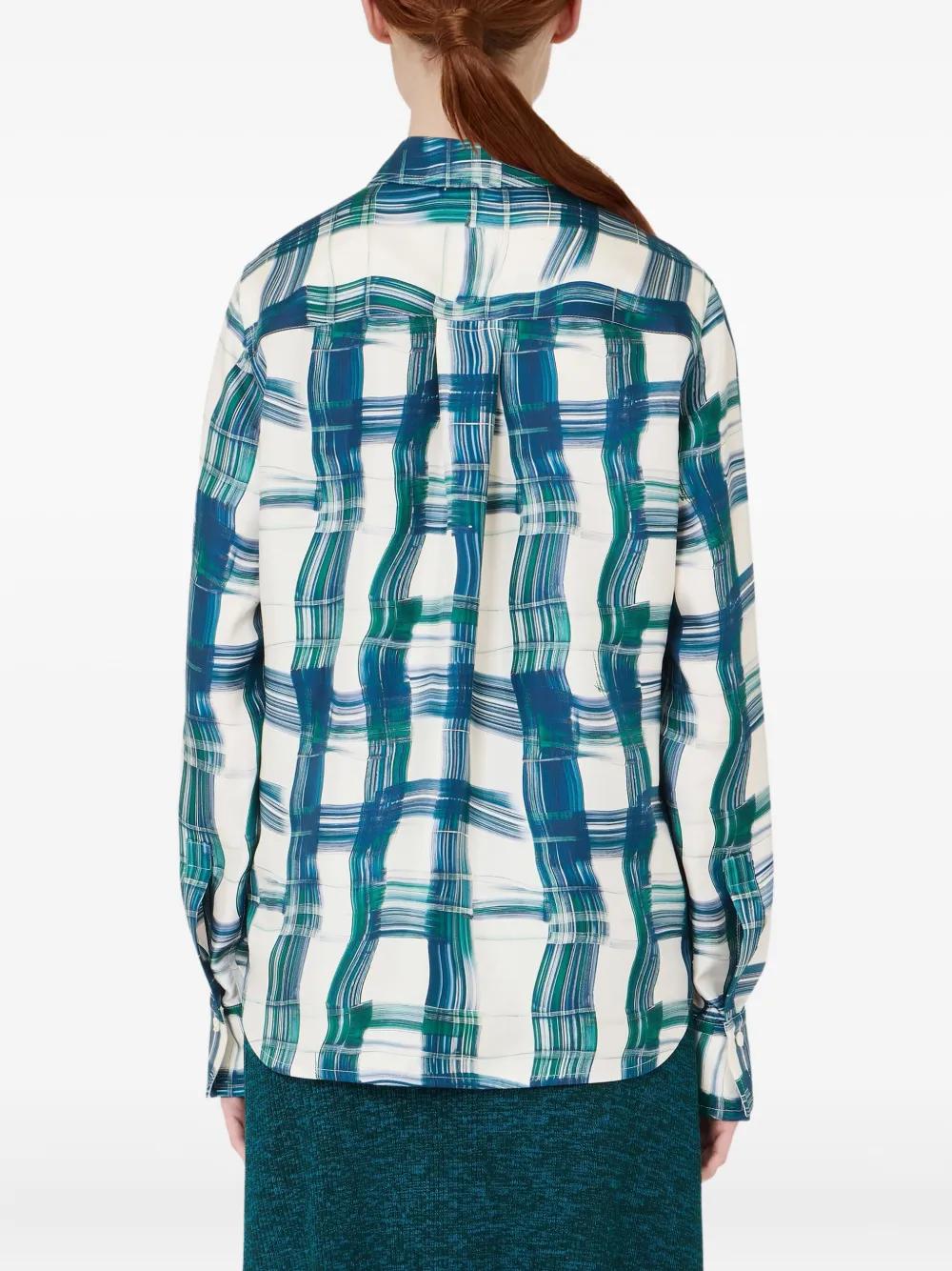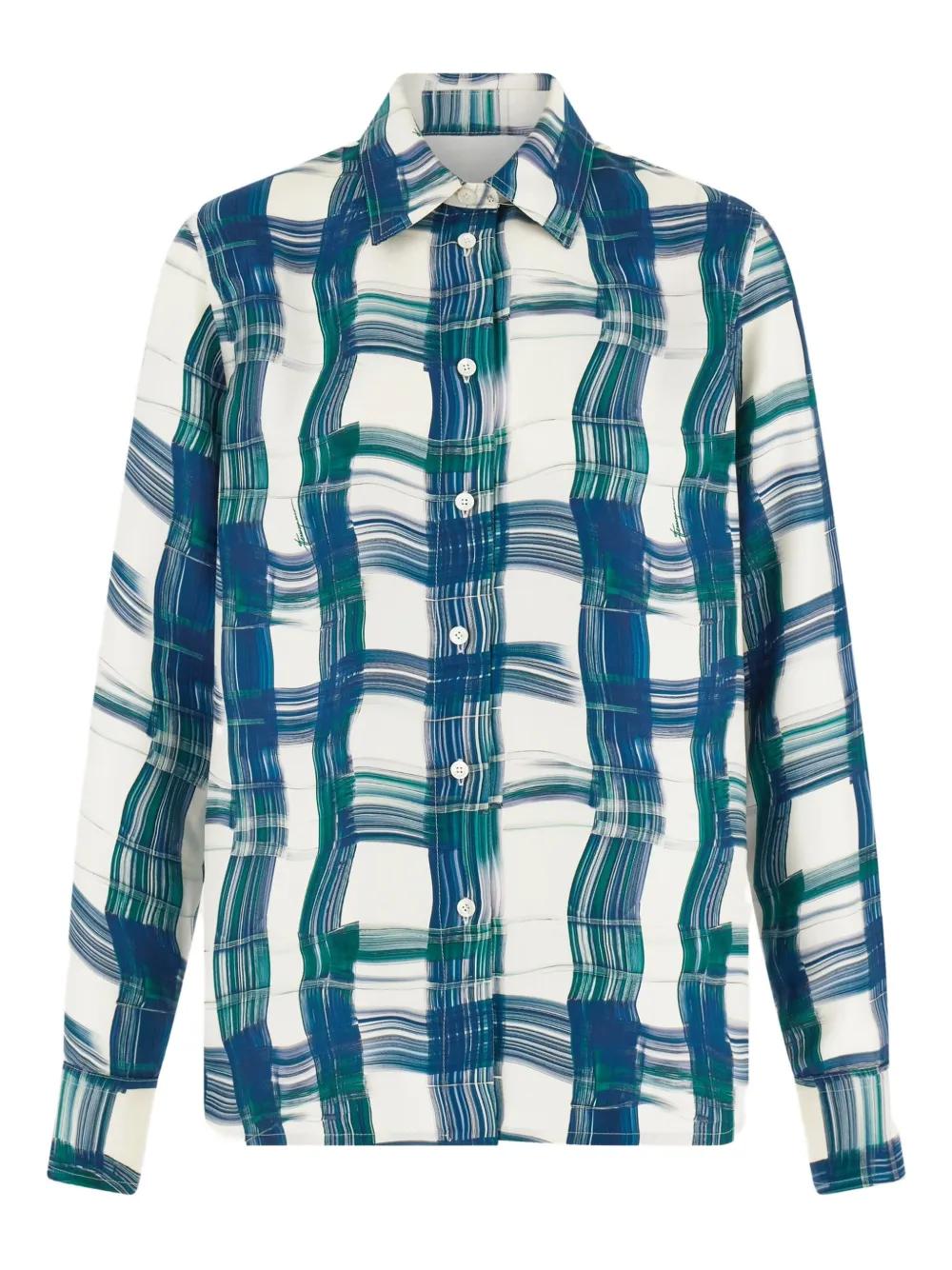 white/blue/green plaid pattern button front fastening classic collar long sleeves straight hem buttoned cuffs