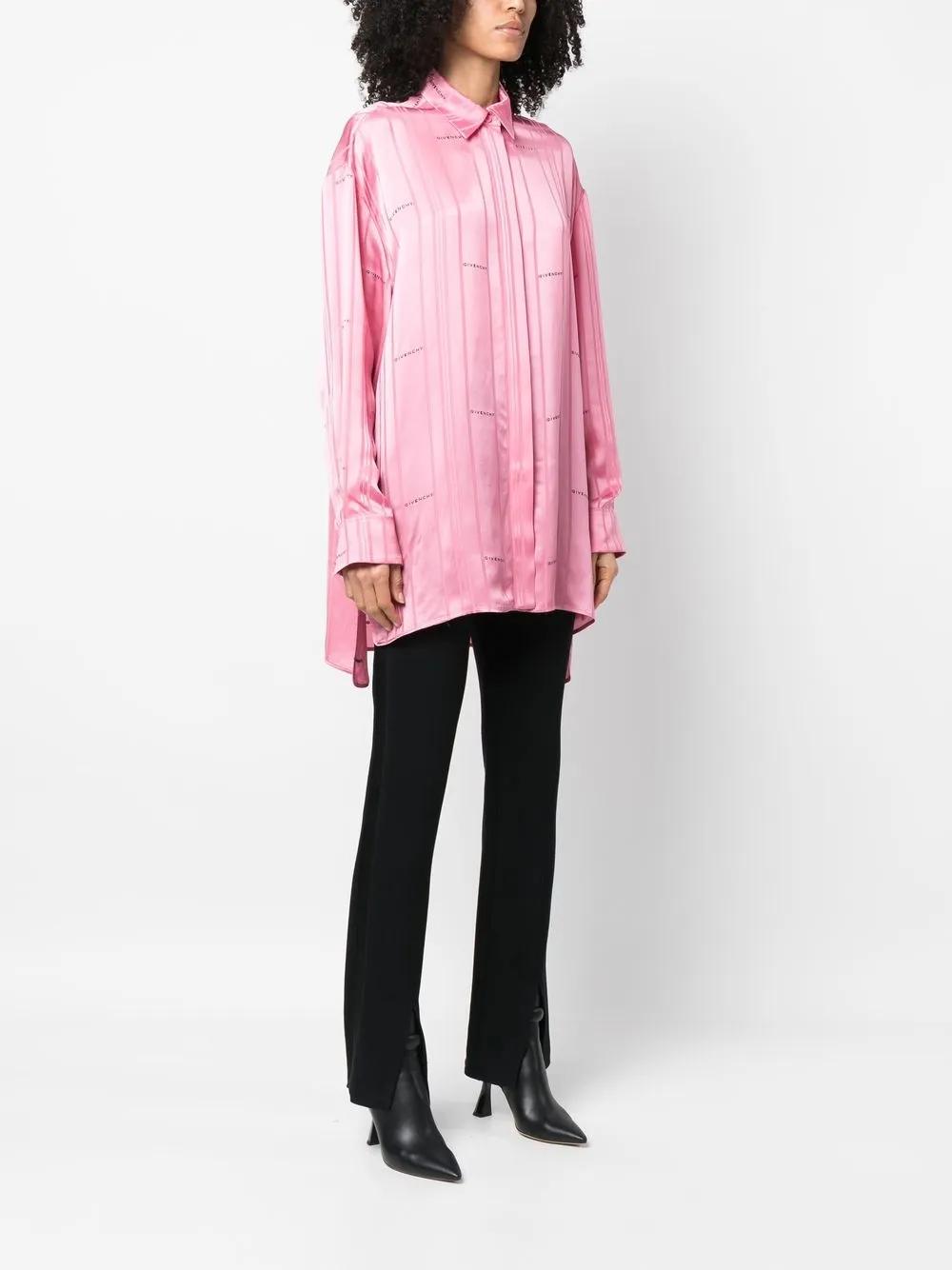bright pink/black satin finish jacquard logo motif vertical stripe pattern spread collar concealed front button fastening long sleeves buttoned cuffs detachable cuff patches short side slits high-low hem