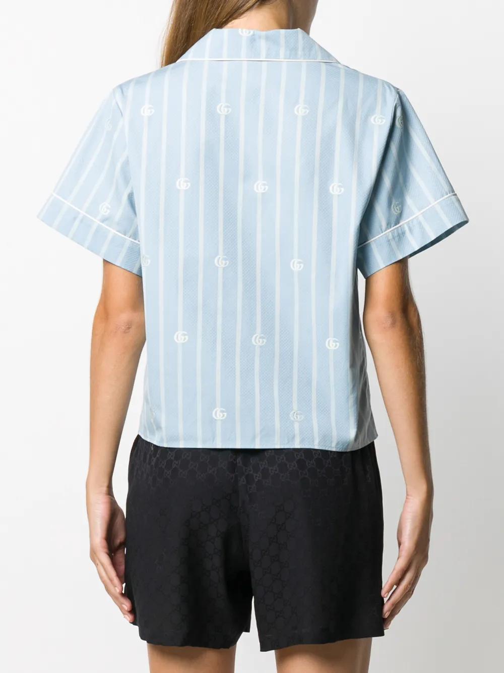 blue/white cotton all-over logo print vertical stripe pattern contrasting trim camp collar short sleeves front button fastening four front patch pockets