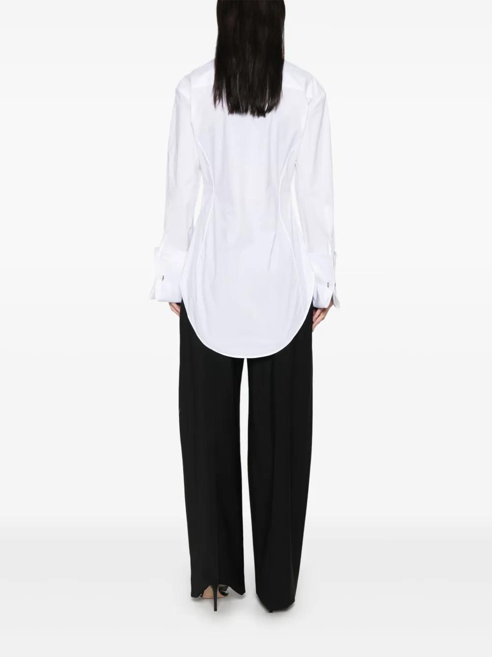 white front button fastening classic collar rear keeper loop turn-up cuffs