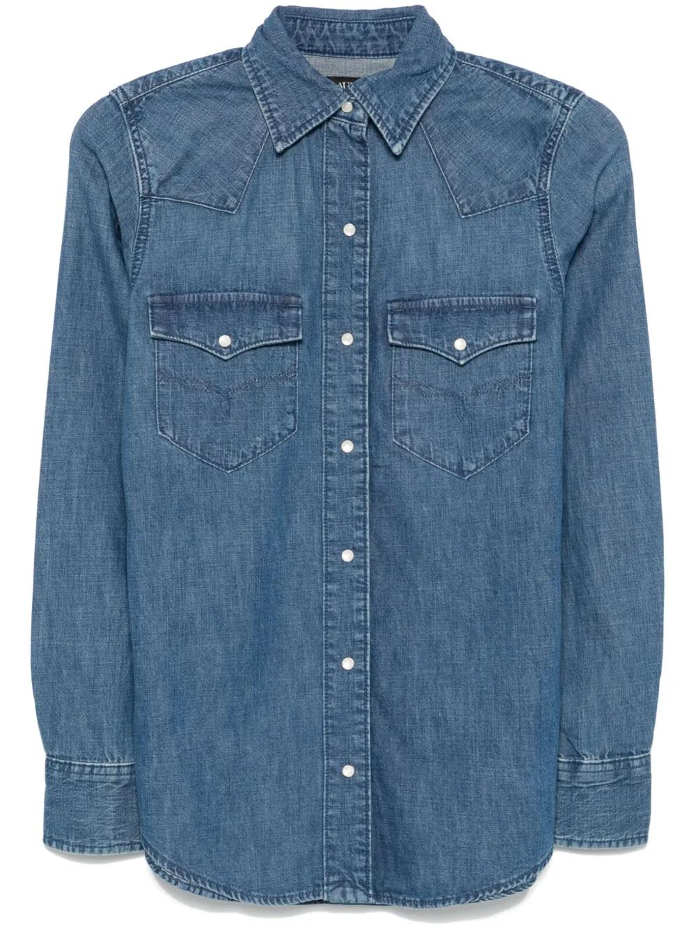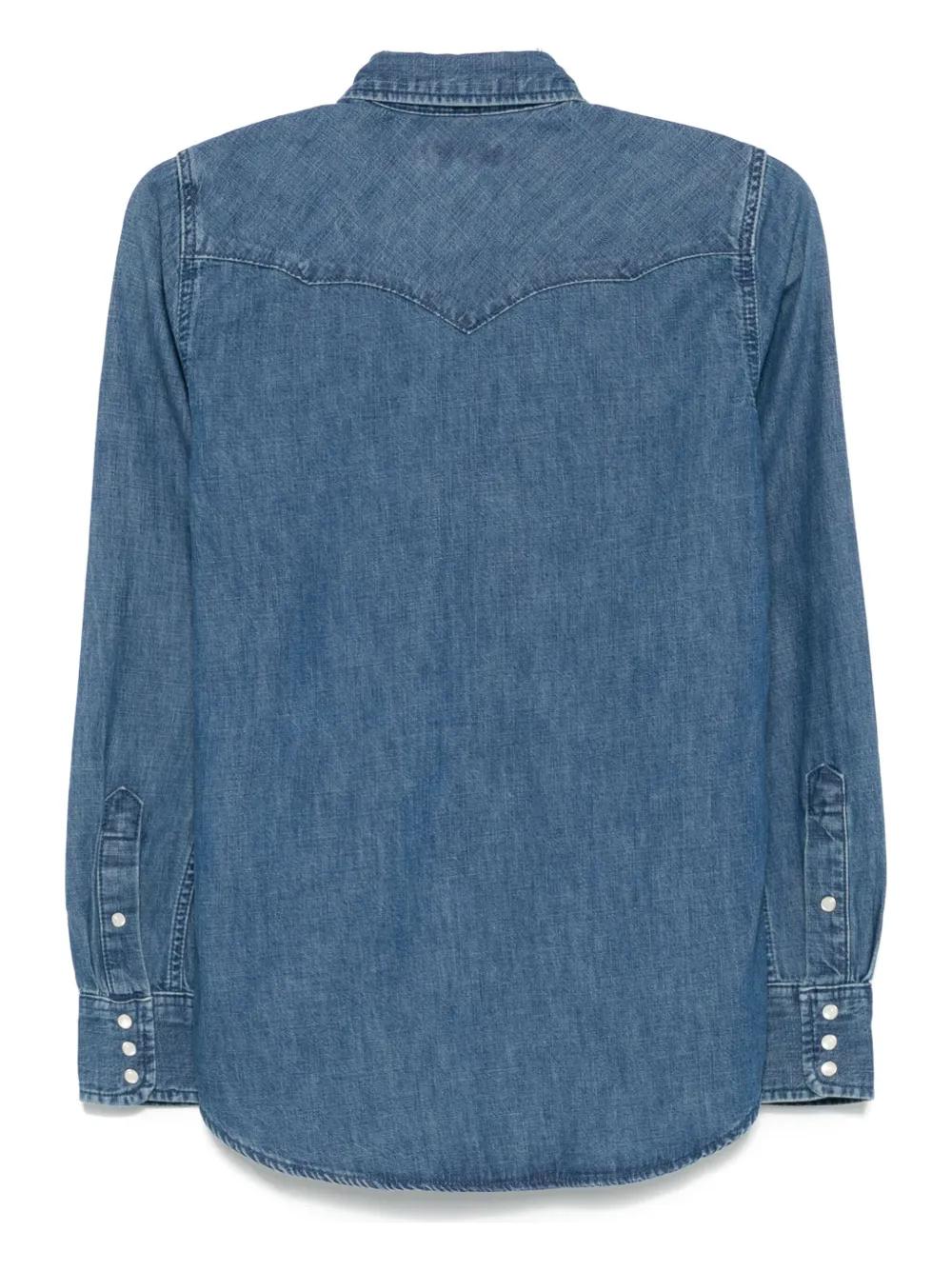 indigo blue cotton denim front press-stud fastening classic collar long sleeves press-stud fastening cuffs two chest flap pockets curved hem