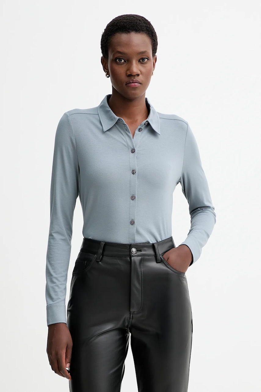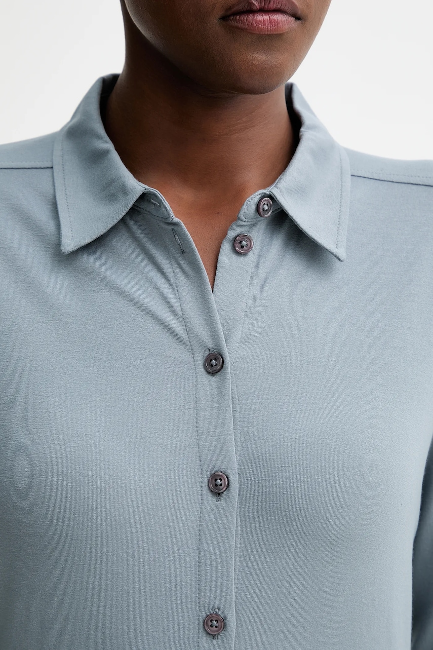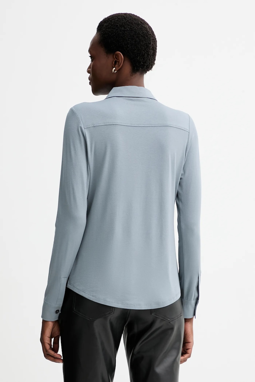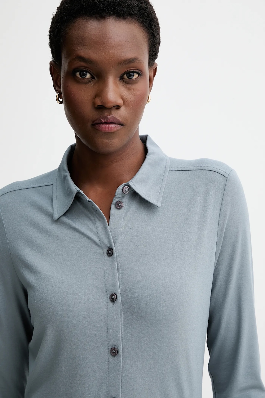 - Wykonane z LENZING™ ECOVERO™ - materiału przyjaznego środowisku. Produkcja LENZING™ ECOVERO™ z ekologicznej celulozy i pulpy drzewnej wykorzystuje o 50% mniej wody w porównaniu do popularnej wiskozy. - Prosty, nie blokujący ruchów fason. - Długi rękaw. - Rękawy z zapinanymi mankietami. - Model z miękkim kołnierzykiem. - Wygodne zapięcie na guziki ułatwia zakładanie i zdejmowanie. - Długość rękawa: 63 cm. - Długość z przodu: 58 cm. - Długość z tyłu: 61 cm. - Szerokość pod pachami: 48 cm. - Wymiary podane dla rozmiaru: S.