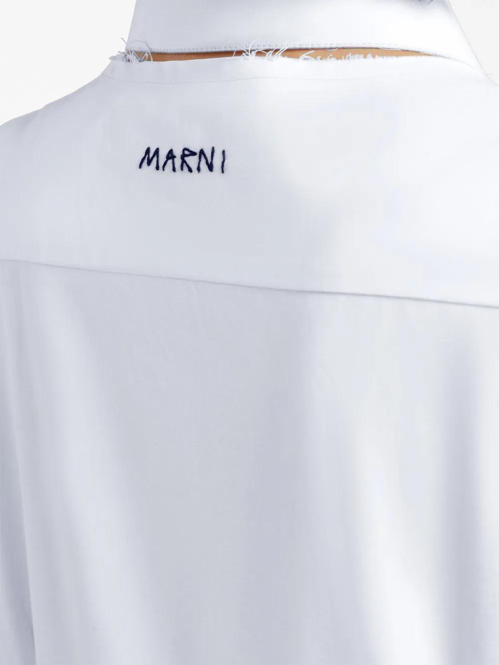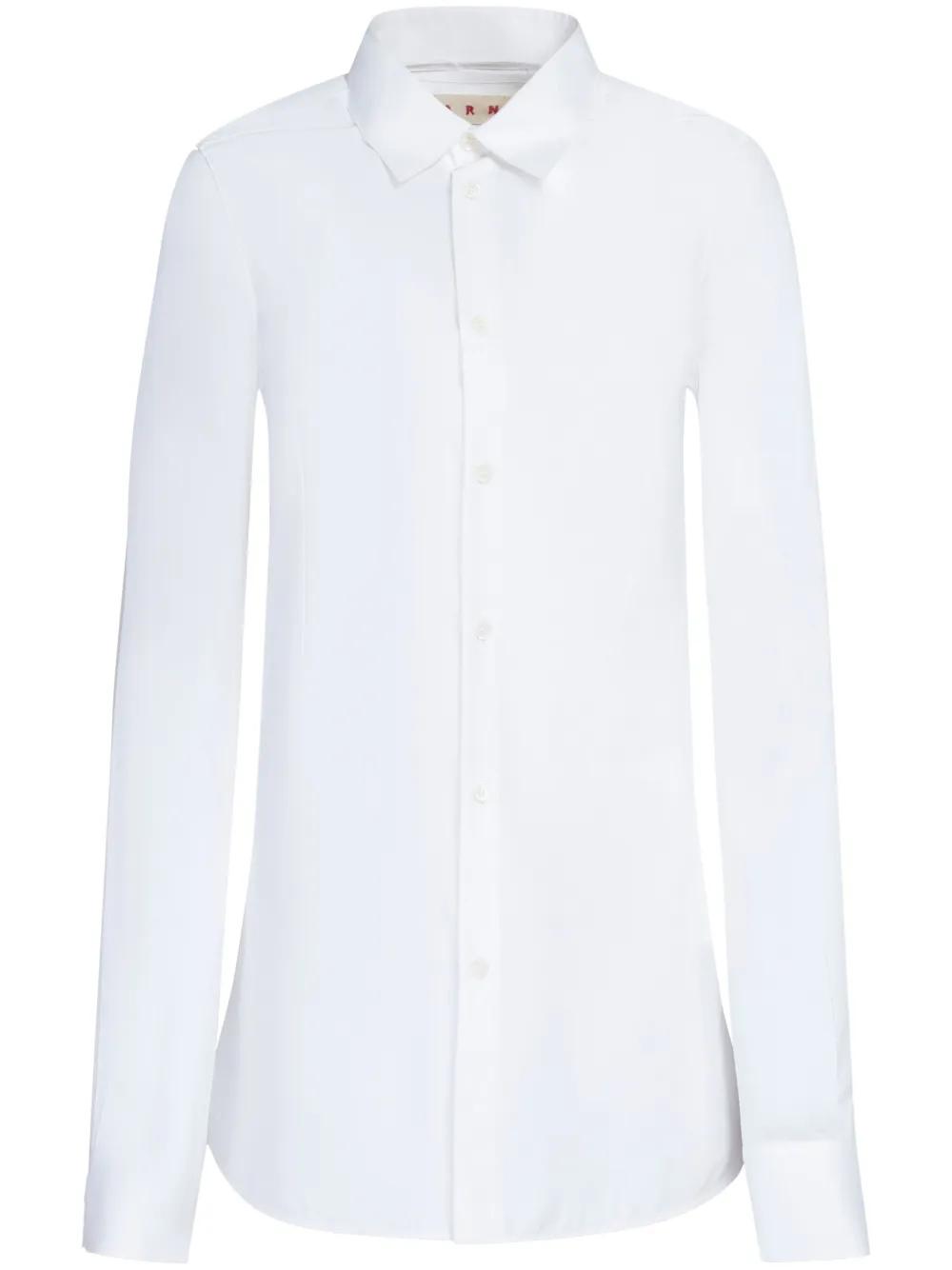 white cotton cut-out detailing embroidered logo to the rear classic collar long sleeves front button fastening curved hem