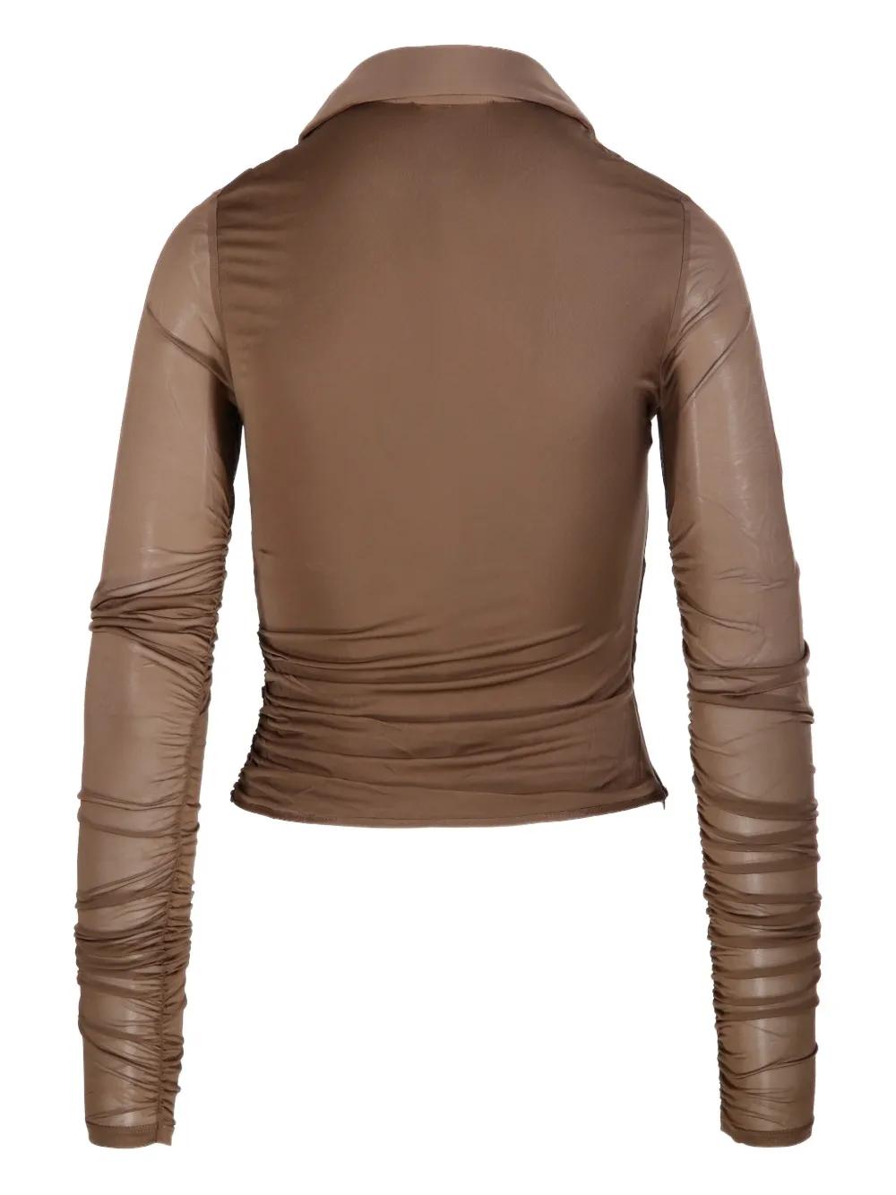 brown classis collar wrap design long sleeves ruched detailing semi-sheer panelling