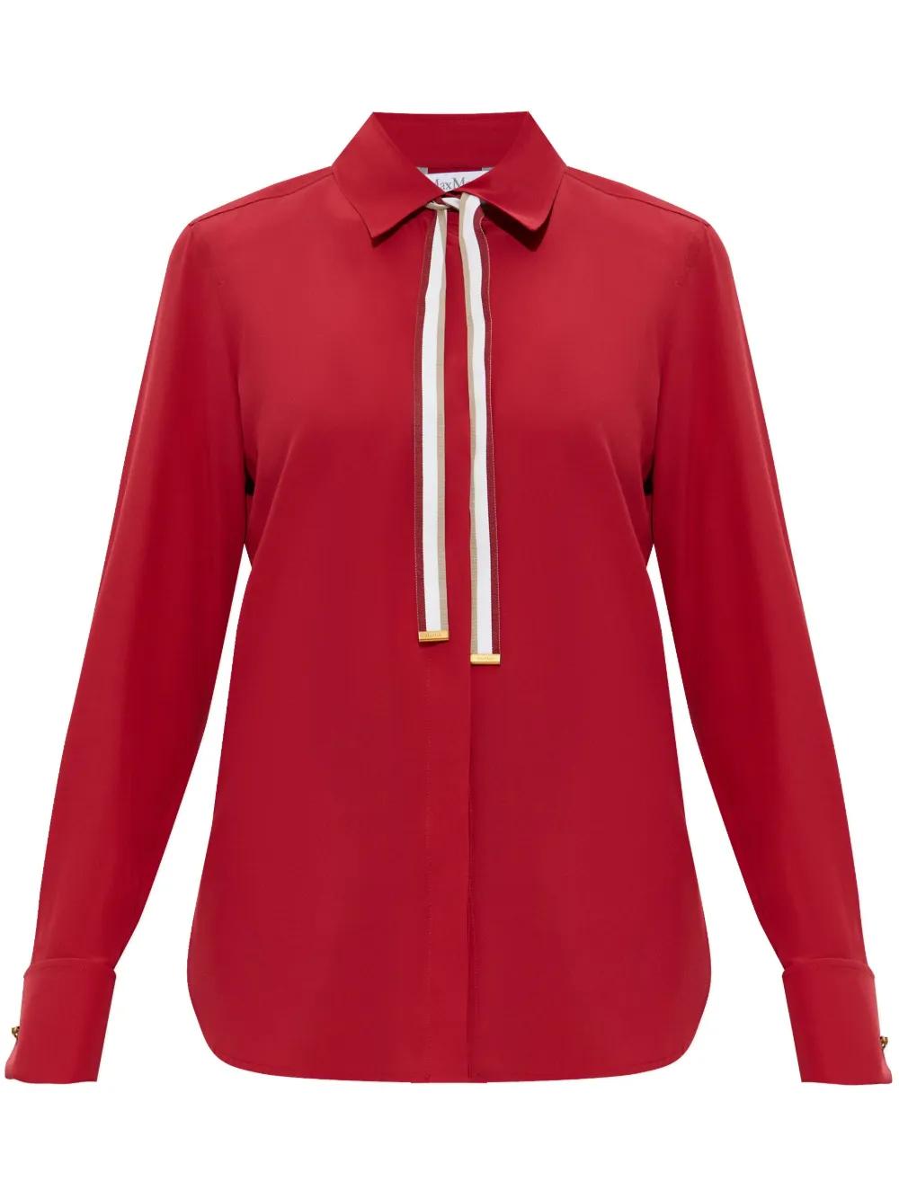 ruby red concealed front fastening front tie fastening spread collar long sleeves