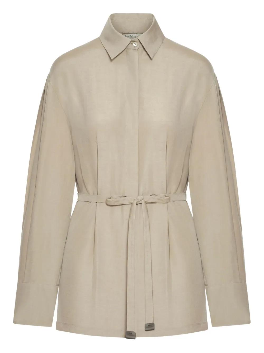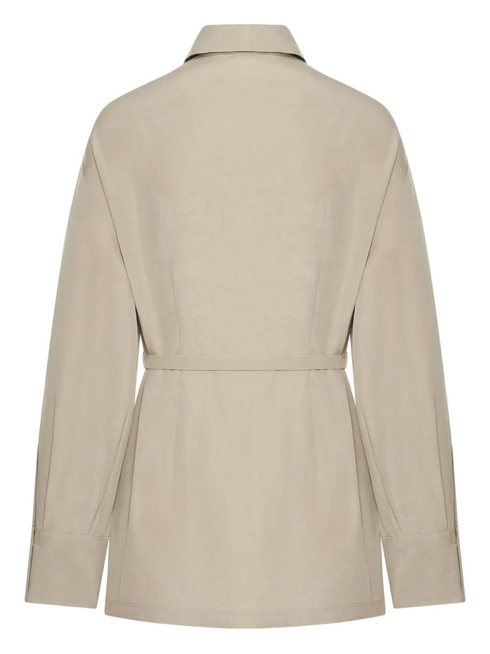 light beige pointed collar adjustable tie belt long sleeves side slits