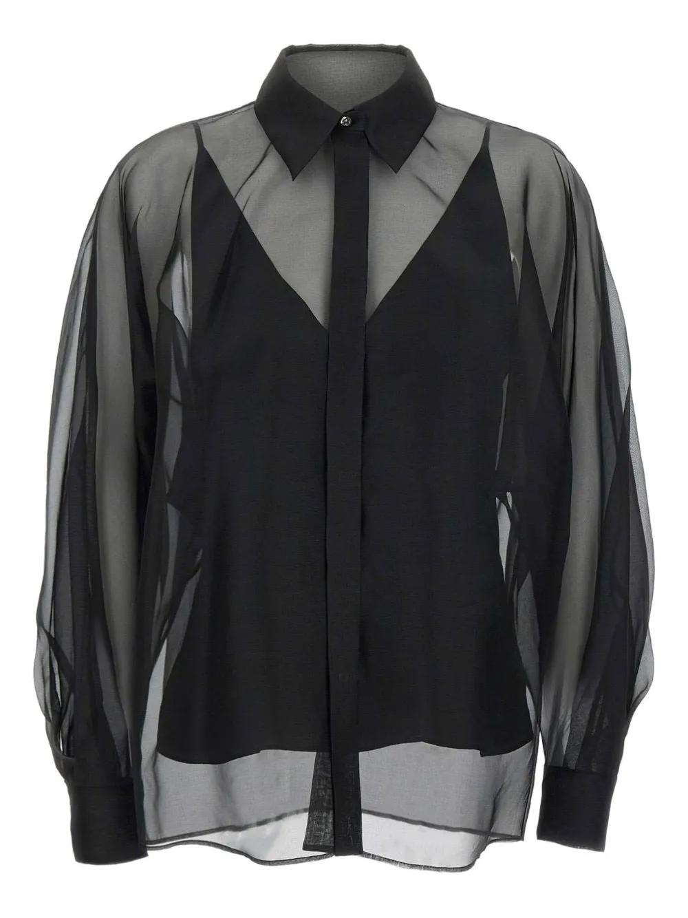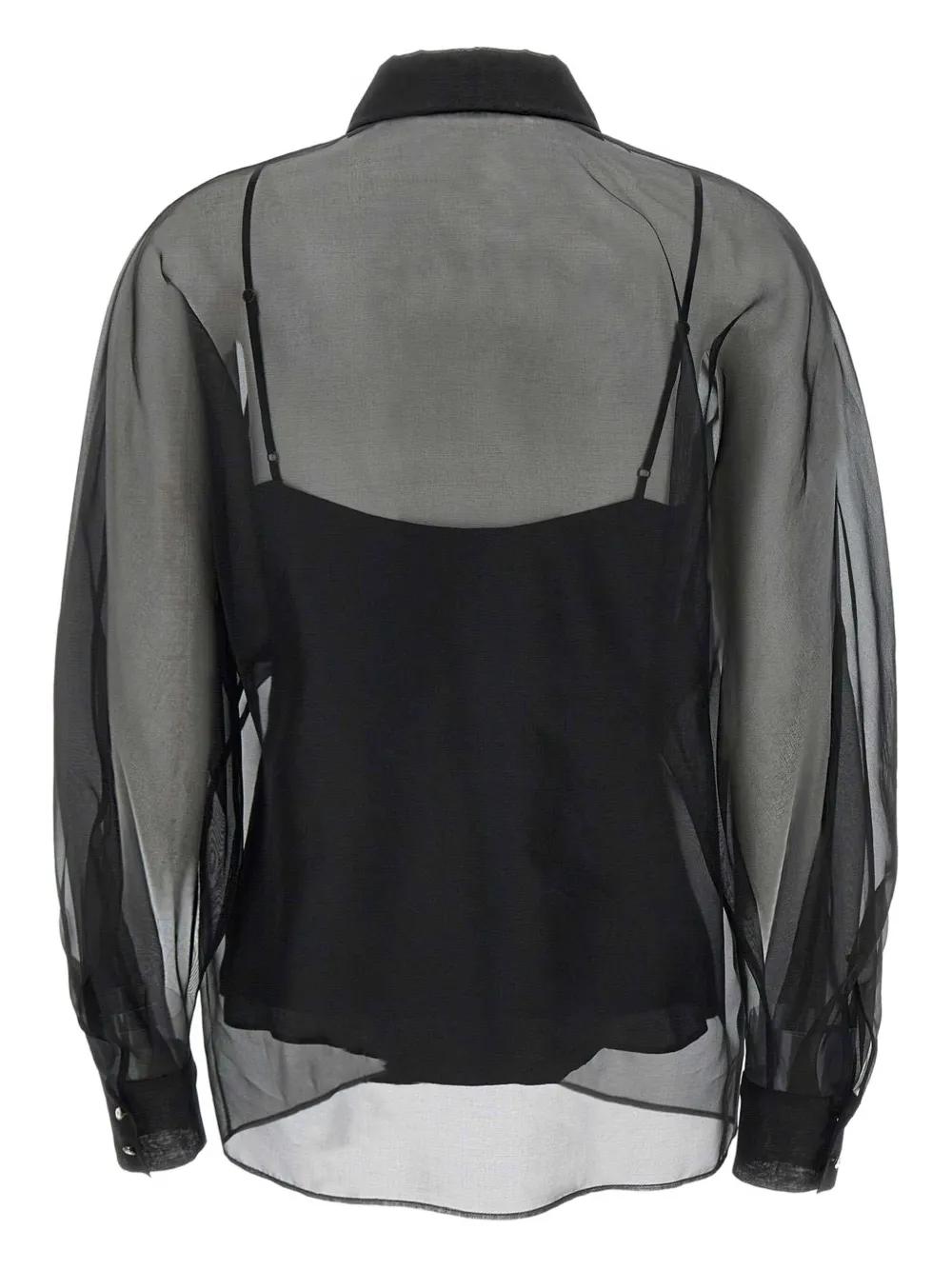 black sheer organza overlay collared neckline long sleeves concealed front fastening