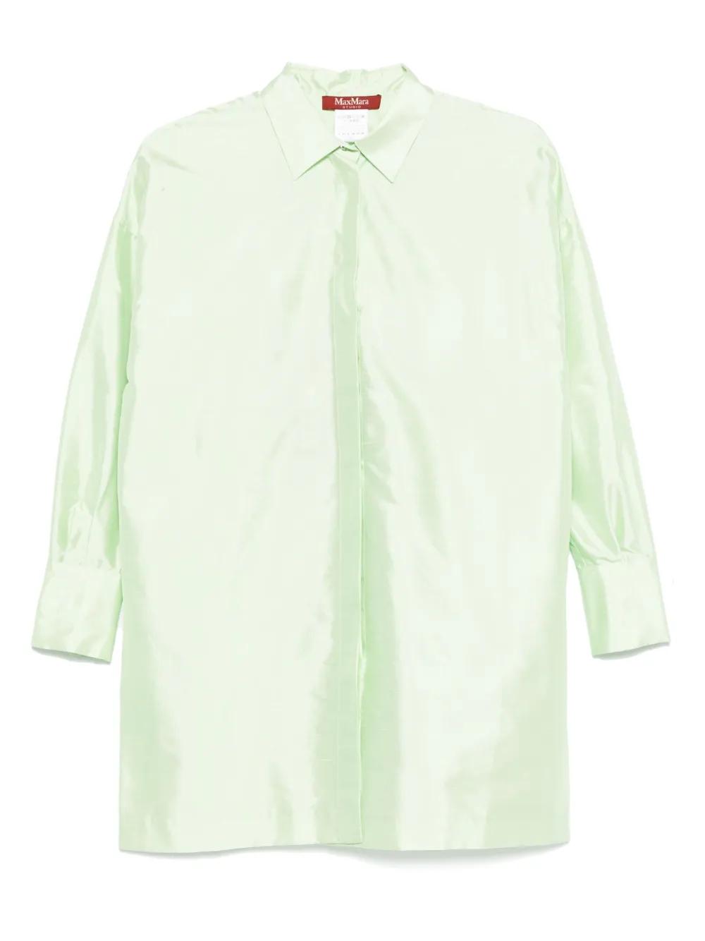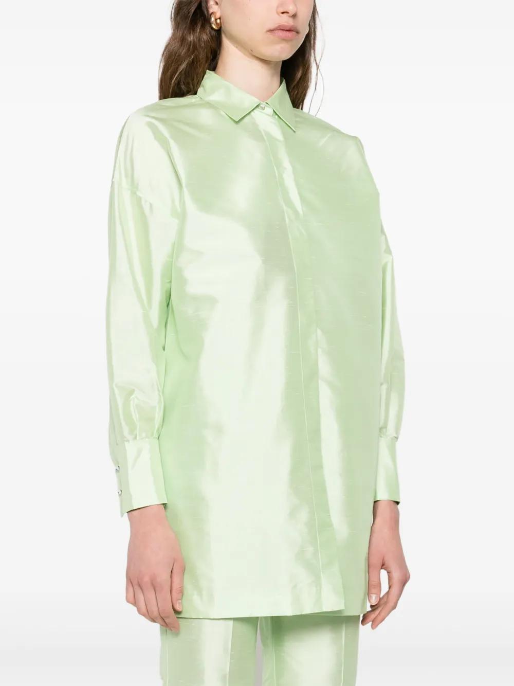 black satin finish tonal stitching classic collar chest patch pocket long sleeves with pleat detailing buttoned cuffs gold-tone buttons curved hem front tonal-button placket