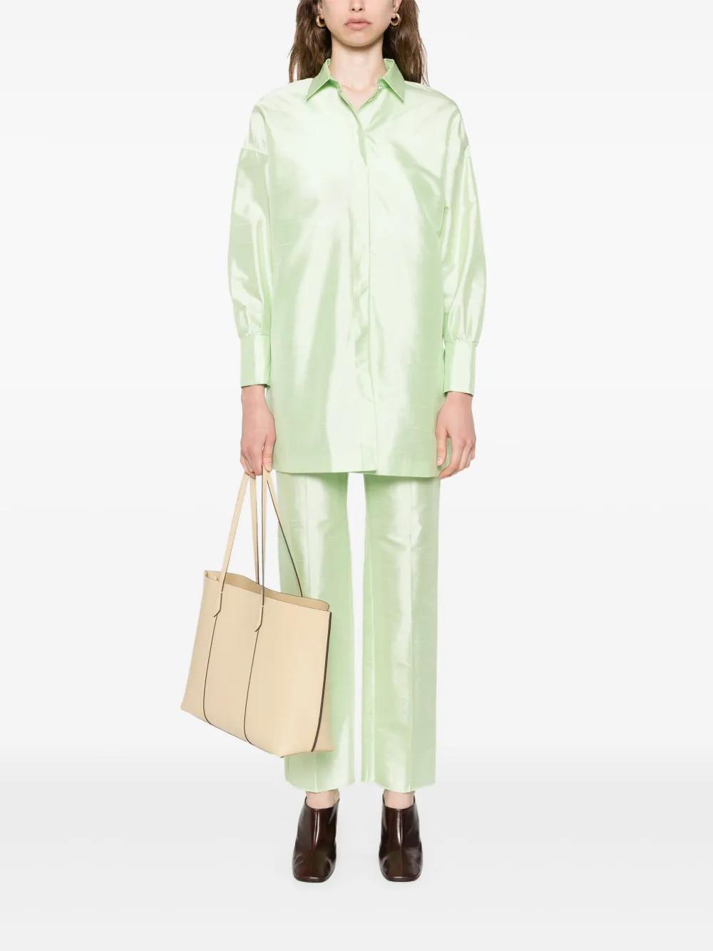 camel brown front button placket French cuffs pleat detailing pointed flat collar