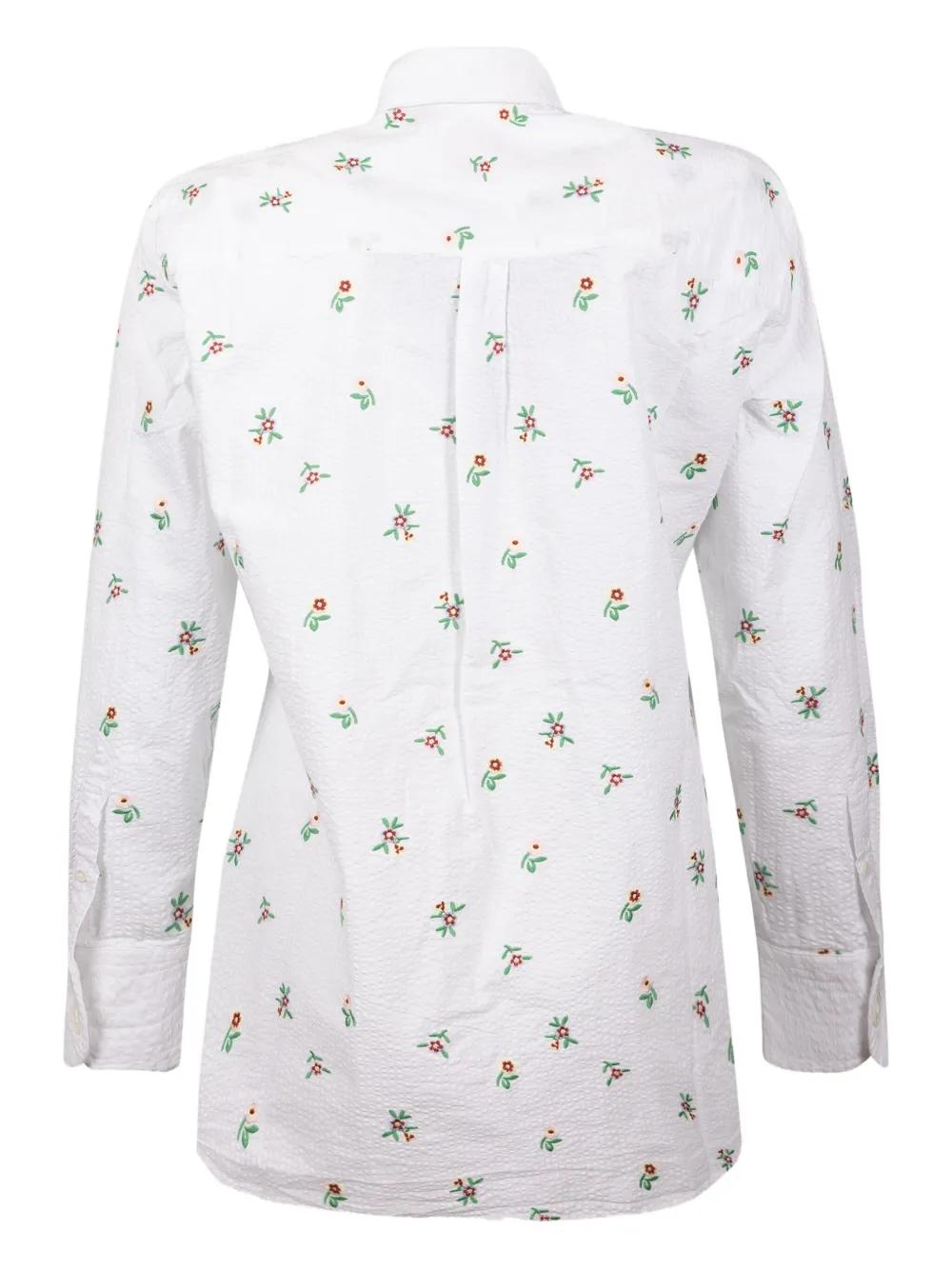 white floral embroidery button closure classic collar long sleeves buttoned cuffs